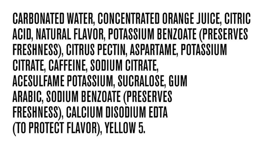Ingredients: Carbonated Water, Concentrated Orange Juice, Citric Acid, Natural Flavor, Potassium Benzoate (Preserves Freshness), Citrus Pectin, Aspartame, Potassium Citrate, Caffeine, Sodium Citrate, Acesulfame Potassium, Sucralose, Gum Arabic, Sodium Benzoate (Preserves Freshness), Calcium Disodium EDTA (to Protect Flavor), Yellow 5