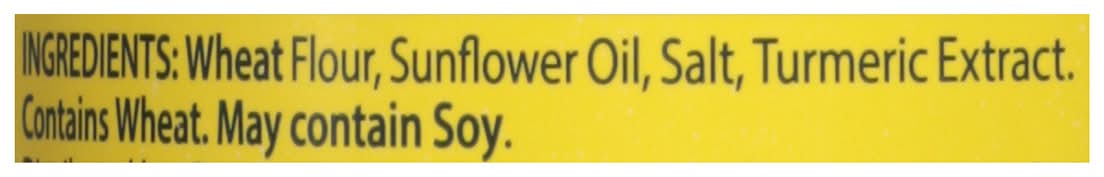 Ingredients: Wheat Flour, Sunflower Oil, Salt, Turmeric Extract Contains: Wheat, Soybeans