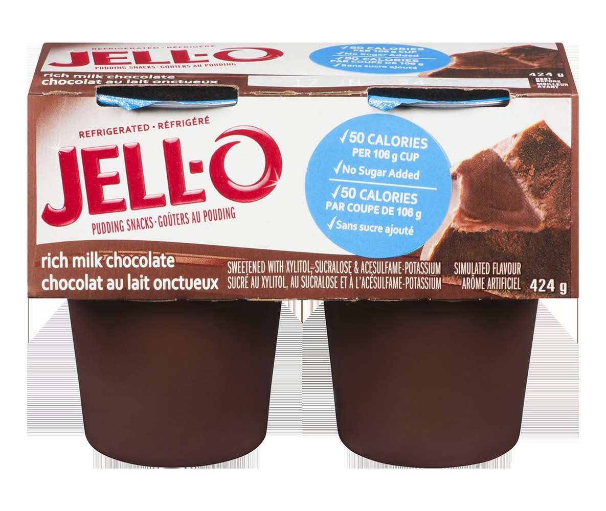 Snack happy. Jell-O Chocolate No Sugar Added Ready-to-Eat Refrigerated Pudding Snacks deliver decadent chocolate flavour in a creamy and smooth pudding cup. Our sweet treat comes in individual snack cups, perfect for putting into a lunch box, eating on the go or snacking at home. Add some wonder to your day with a delicious, convenient snack cup. Our pudding snack treats your taste buds to creamy, smooth pudding made with no added sugar. Each Jell-O cup contains 60 calories per serving. Every 424 g sleeve contains four pudding cups for quick and easy snacking. Spoon up a smile with Jell-O Chocolate No Sugar Added Ready-to-Eat Refrigerated Pudding Snacks. Flavor: Chocolate
