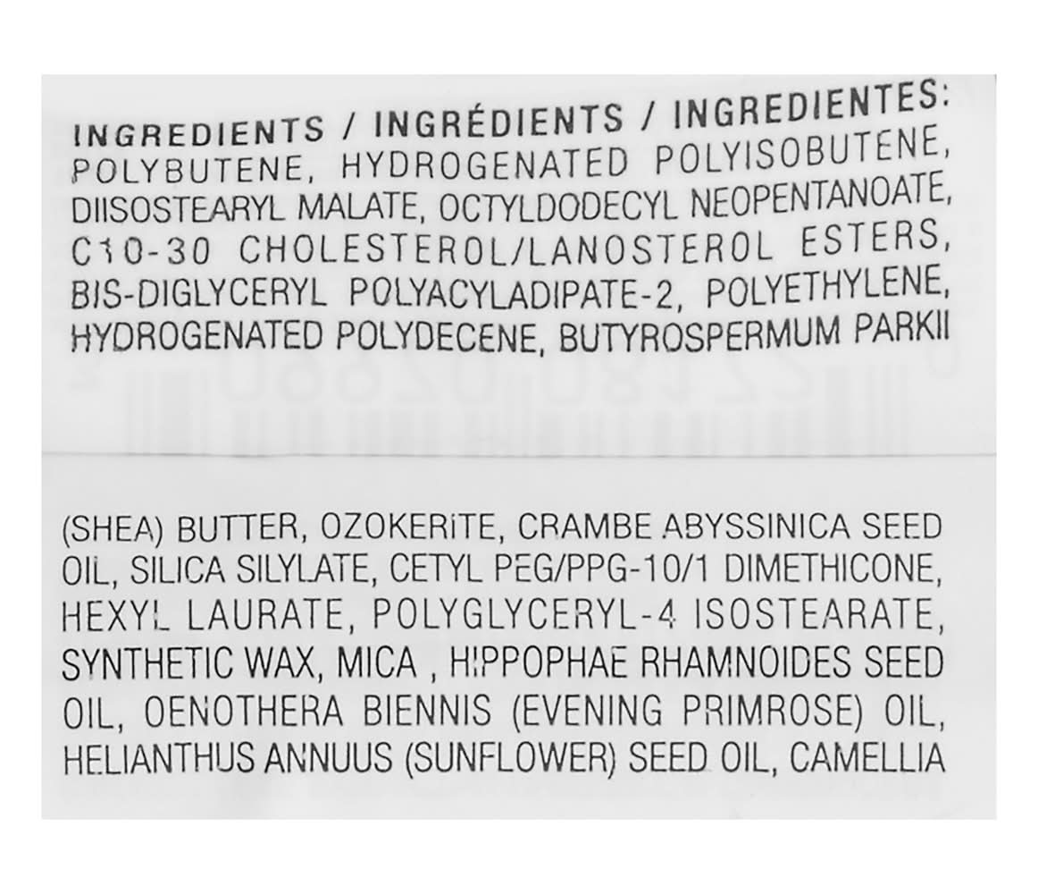 Ingredients: Polybutene, Hydrogenated Polyisobutene, Diisostearyl Malate, Octyldodecyl Neopentanoate, C10-30 Cholesterol/Lanosterol Esters, Bis-Diglyceryl Polyacyladipate-2, Polyethylene, Hydrogenated Polydecene, Butyrospermum Parkii (Shea) Butter, Ozokerite, Crambe Abssinica Seed Oil, Silica Silylate, Cetyl PEG/PPG-10/1 Dimethicone, Hexyl Laurate, Polyglyceryl-4 Isostearate, Synthetic Wax, Mica, Hippophae Rhamoides Seed Oil, Oenothera Biennis (Evening Primrose) Oil, Helianthus Annuus (Sunflower) Seed Oil, Camellia Sinensis Leaf Extract, Aluminum Calcium Sodium Silicate, BHT, Calcium Aluminum Borosilicate, Cera Alba/Beeswax/Cire D'Abeille, Silica, Iron Oxides (CI 77491, 77499), Titanium Dioxide (CI 77891), Yellow 5 Lake (CI 19140) Contains: Tree Nuts