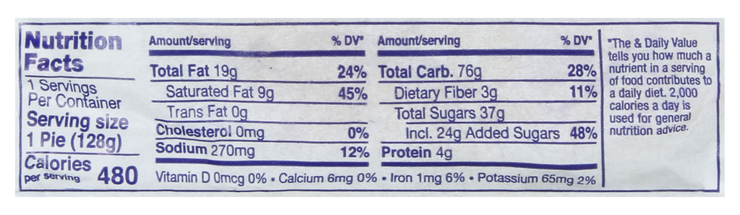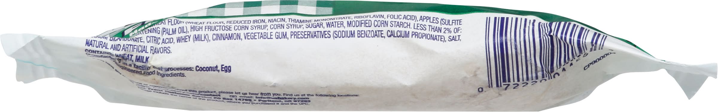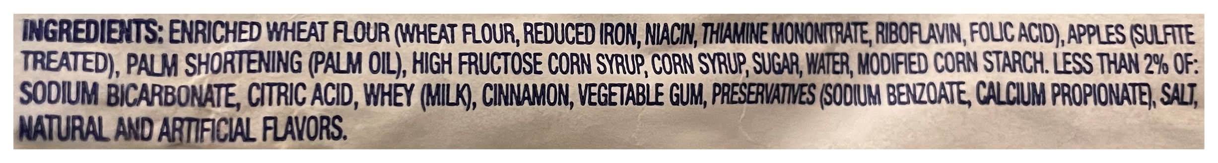 Ingredients: Enriched Wheat Flour (Wheat Flour, Reduced Iron, Niacin, Thiamine Mononitrate, Riboflavin, Folic Acid), Apples (Sulfite Treated), Palm Shortening (Palm Oil), High Fructose Corn Syrup, Corn Syrup, Sugar, Water, Modified Corn Starch. Less than 2% of: Sodium Bicarbonate, Citric Acid, Whey (Milk), Cinnamon, Vegetable Gum, Preservatives (Sodium Benzoate, Calcium Propionate), Salt, Natural and Artificial Flavors Contains: Wheat, Corn, Milk, Sulfites, Tree Nuts, Coconuts, Eggs
