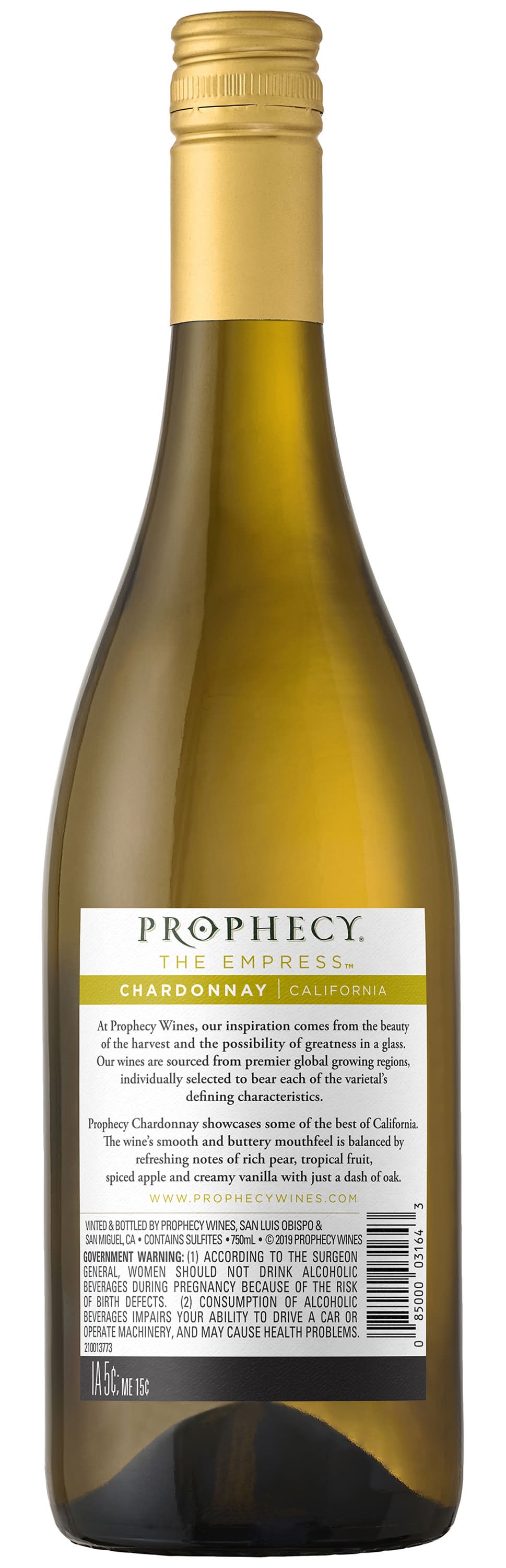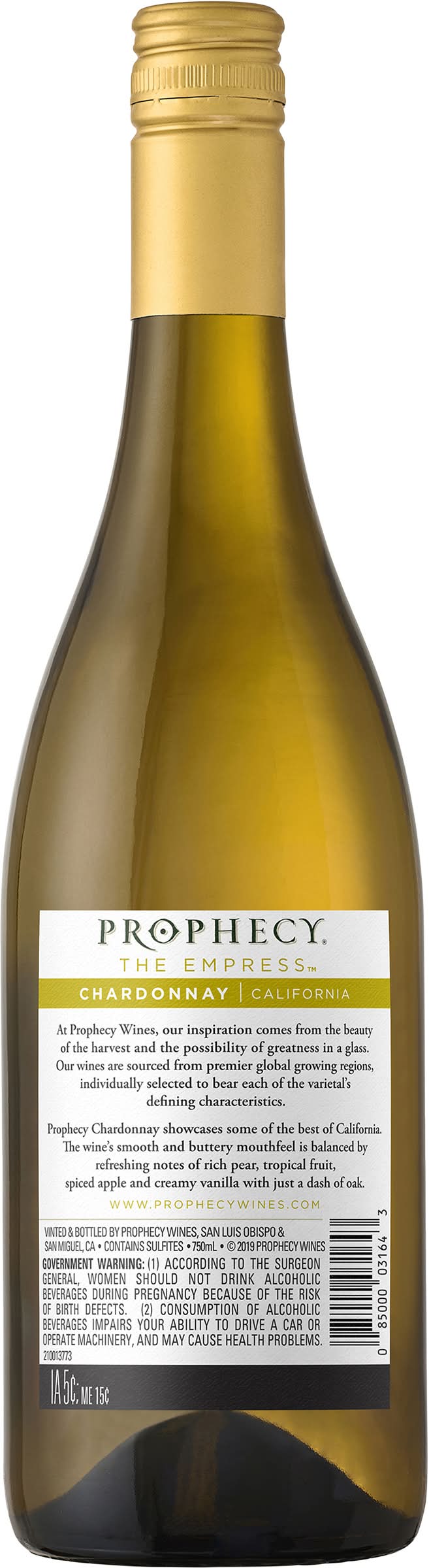 Buttery Chardonnay White Wine • Brand: Prophecy • Alcohol by volume: 14.7% • Full bodied • Sweet-dry scale: dry • Food pairing: pasta, shellfish • Suggested serving temperature: 55° F • Suggested glassware: chardonnay glass • Prophecy Wines, San Luis Obispo & San Miguel, CA.
