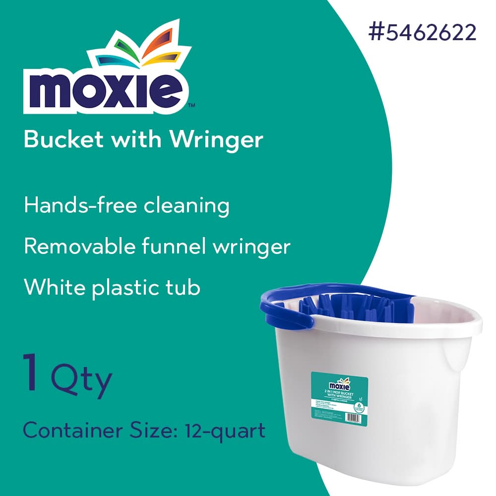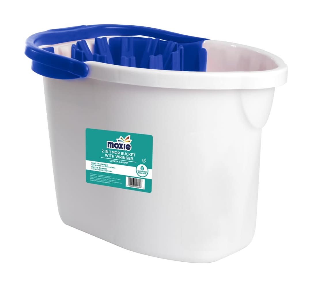12 Quart bucket capacity. 2-in-1 bucket with mop wringer. Quick wring system thoroughly wrings water for hands-free cleaning. Color: White