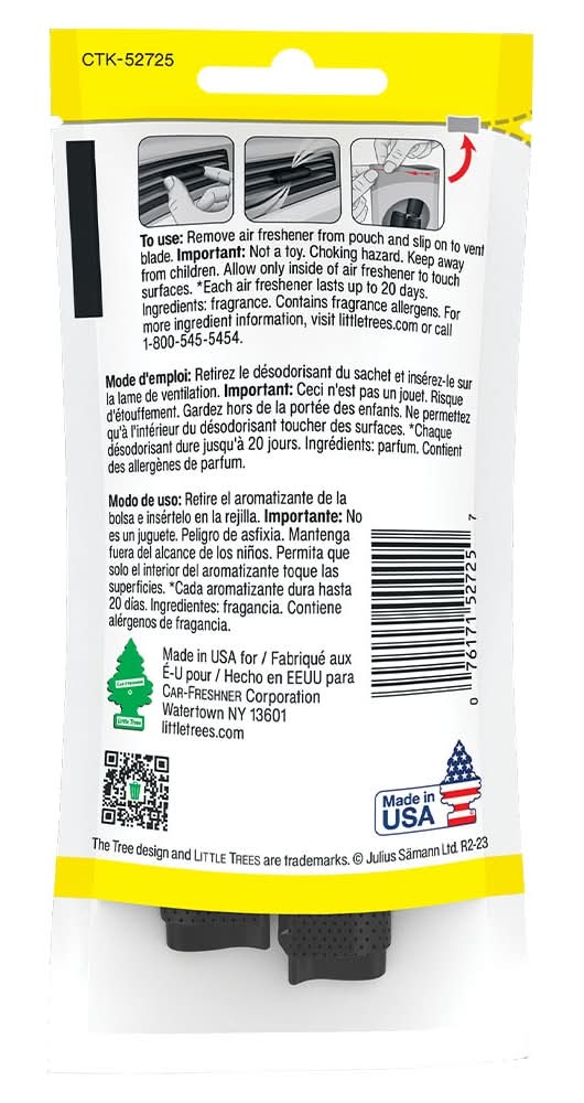 An escape to a tropical island with juicy pineapple and sweet coconut. With 2 weeks of steady fragrance per Vent Wrap, a 4-pack delivers up to 60 days of fragrance. Vent Wrap comes in a stay-fresh pouch, sealing in the fragrance until you are ready to use it. All of our LITTLE TREES Vent Wrap auto air fresheners are made in the USA with high-quality, strong and long-lasting fragrance.