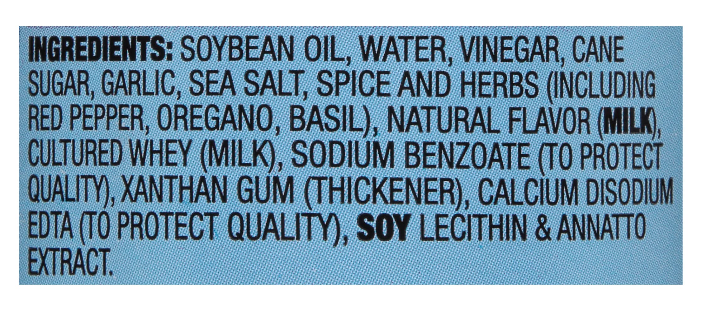Ingredients: Soybean Oil, Water, Vinegar, Cane Sugar, Garlic, Sea Salt, Spice and Herbs (Including Red Pepper, Oregano, Basil), Natural Flavor (Milk), Cultured Whey (Milk), Sodium Benzoate (to Protect Quality), Xanthan Gum (Thickener), Calcium Disodium EDTA (to Protect Quality), Soy Lecithin Annatto Extract. Contains: soy, milk