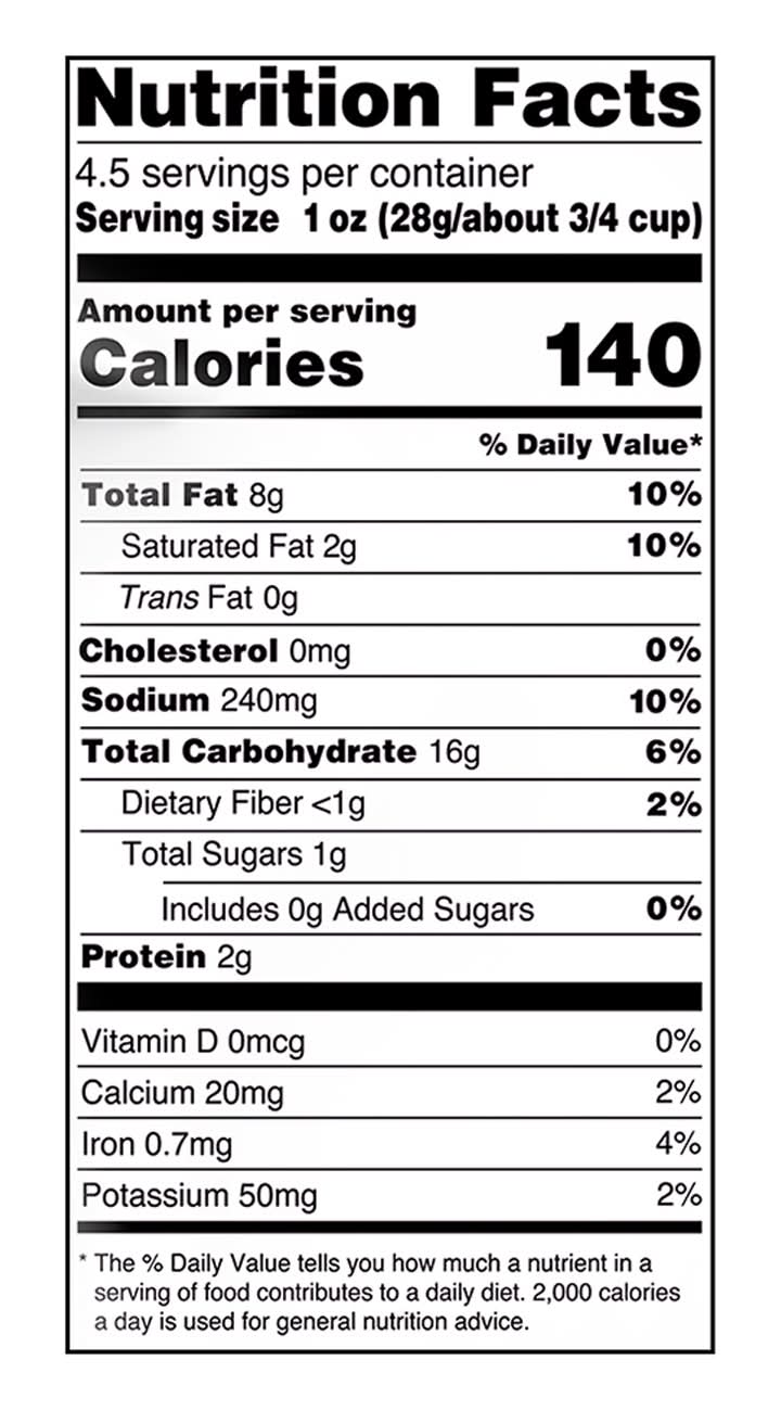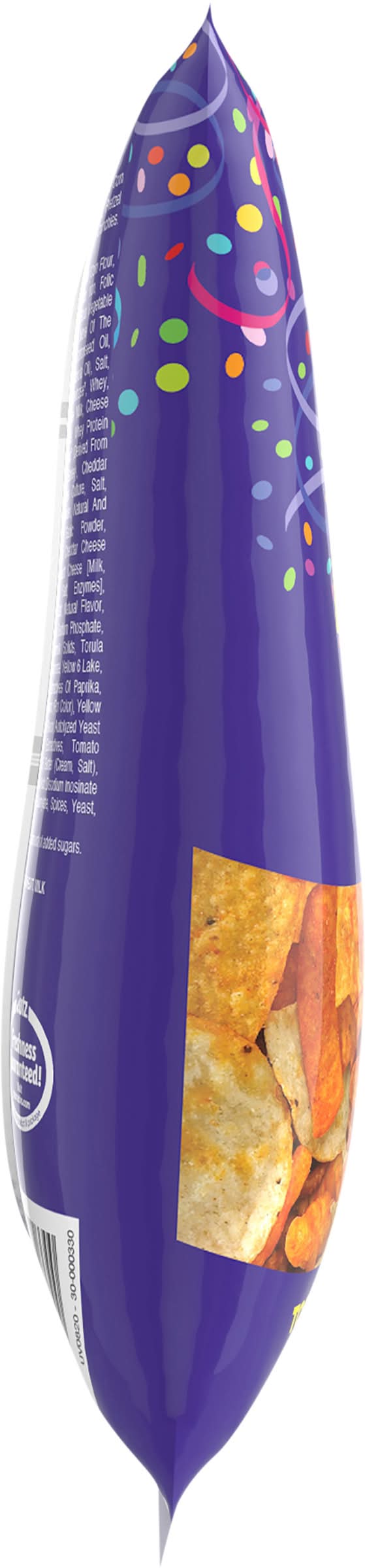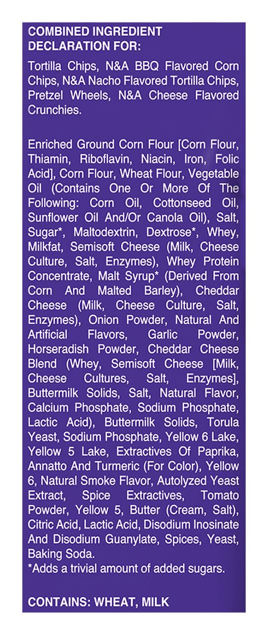 Ingredients: Combined Ingredient Declaration for: Tortilla Chips, Bbq Flavored Corn Chips, N&A Nachos Flavored Tortilla Chips, Pretzel Wheels, N&A Cheese Flavored Crunchies, Enriched Ground Corn Flour [Corn Flour, Thiamin, Riboflavin, Niacin, Iron, Folic Acid], Corn Flour, Wheat Flour, Vegetable Oil (Contains One or More of the Following: Corn Oil, Cottonseed Oil, Sunflower Oil and/or Canola Oil), Salt, Sugar, Maltodextrin, Dextrose (Adds a Trivial Amount of Added Sugars), Whey, Milkfat, Semisoft Cheese (Milk, Cheese Culture, Salt, Enzymes), Whey Protein Concentrate, Malt Syrup (Adds a Trivial Amount of Added Sugars)(Derived from Corn and Malted Barley), Cheddar Cheese (Milk, Cheese Culture, Salt, Enzymes), Onion Powder, Natural and Artificial Flavors, Garlic Powder, Horseradish Powder, Cheddar Cheese Blend (Whey, Semisoft Cheese [Milk, Cheese Cultures, Salt, Enzymes], Buttermilk Solids, Salt, Natural Flavor, Calcium Phosphate, Sodium Phosphate, Lactic Acid), Buttermilk Solids, Torula Yeast, Sodium Phosphate, Yellow 6 Lake, Yellow 5 Lake, Extractives of Paprika, Annatto and Turmeric (for Color), Yellow 6, Natural Smoke Flavor, Autolyzed Yeast Extract, Spice Extractives, Tomato Powder, Yellow 5, Butter (Cream, Salt), Citric Acid, Lactic Acid, Disodium Inosinate and Disodium Guanylate, Spices, Yeast, Baking Soda Contains: Wheat, Milk, Corn, Barley