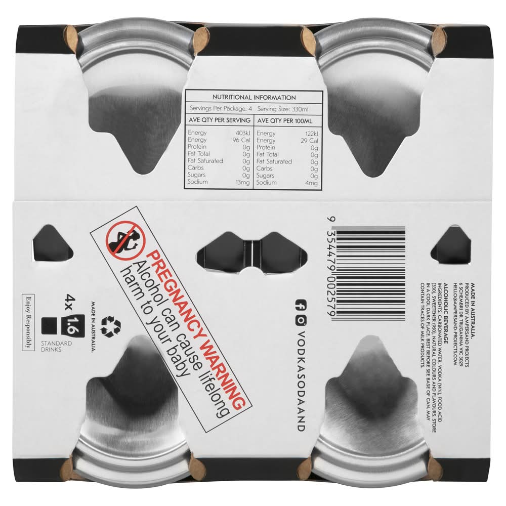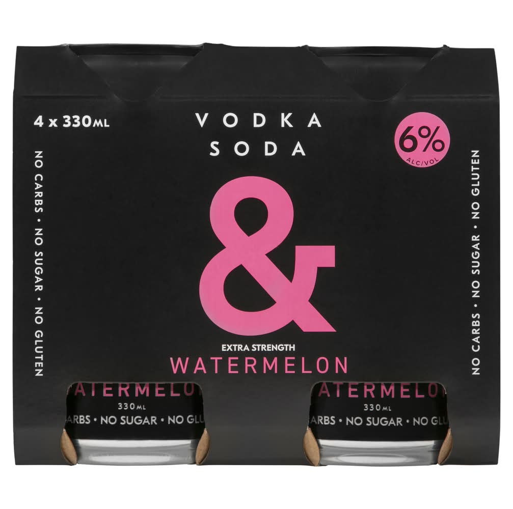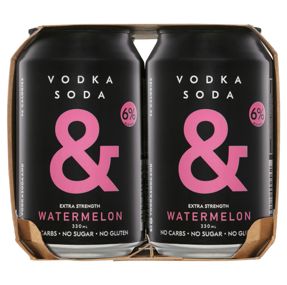 Vodka Soda & Watermelon is a blend of fresh watermelon flavour and our super smooth vodka • Brand: Ampersand projects • Flavor: Watermelon • Pack size: 4 • Alcohol by volume: 6%