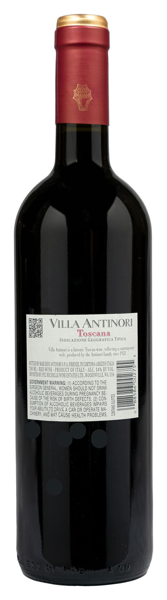 ANTINORI VILLA TOSCANA ROSSO • Brand: Villa antinori • Category: Red blend • Alcohol by volume: 13.5% • Medium bodied • Sweet-dry scale: dry • Tasting notes: berry, bold, dried fruit, fruity, nutty, red fruit, smooth, spicy, vanilla, velvety • Food pairing: beef, pasta, pork • Suggested serving temperature: 65° F • Suggested glassware: standard red glass • 0