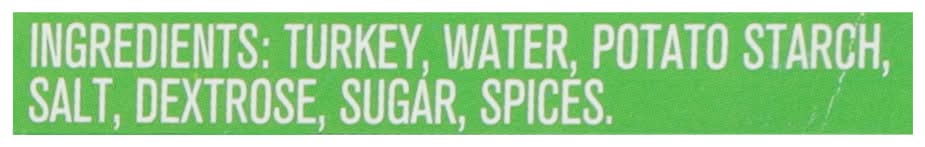 Ingredients: Turkey, Water, Potato Starch, Salt, Dextrose, Sugar, Spices
