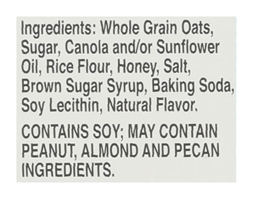 Ingredients: Whole Grain Oats, Sugar, Canola and/or Sunflower Oil, Rice Flour, Honey, Salt, Brown Sugar Syrup, Baking Soda, Soy Lecithin, Natural Flavor Contains: Soybeans, Oat, Peanuts, Tree Nuts, Almonds, Tree Nuts, Pecans Additives: Genetically Modified Ingredients