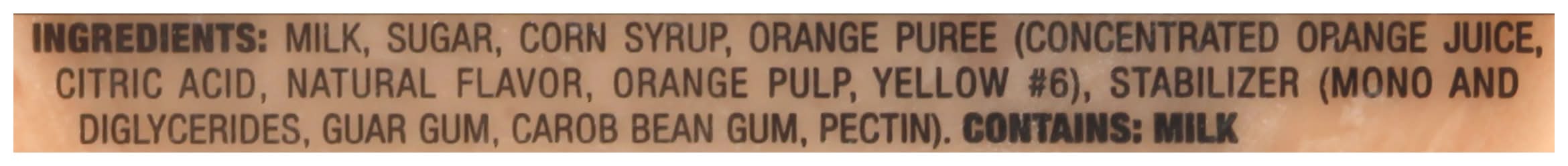 Ingredients: Milk, Sugar, Corn Syrup, Orange Puree (Concentrated Orange Juice, Citric Acid, Natural Flavor, Orange Pulp, Yellow 6), Stabilizer (Mono and Diglycerides, Guar Gum, Carob Bean Gum, Pectin) Contains: Milk