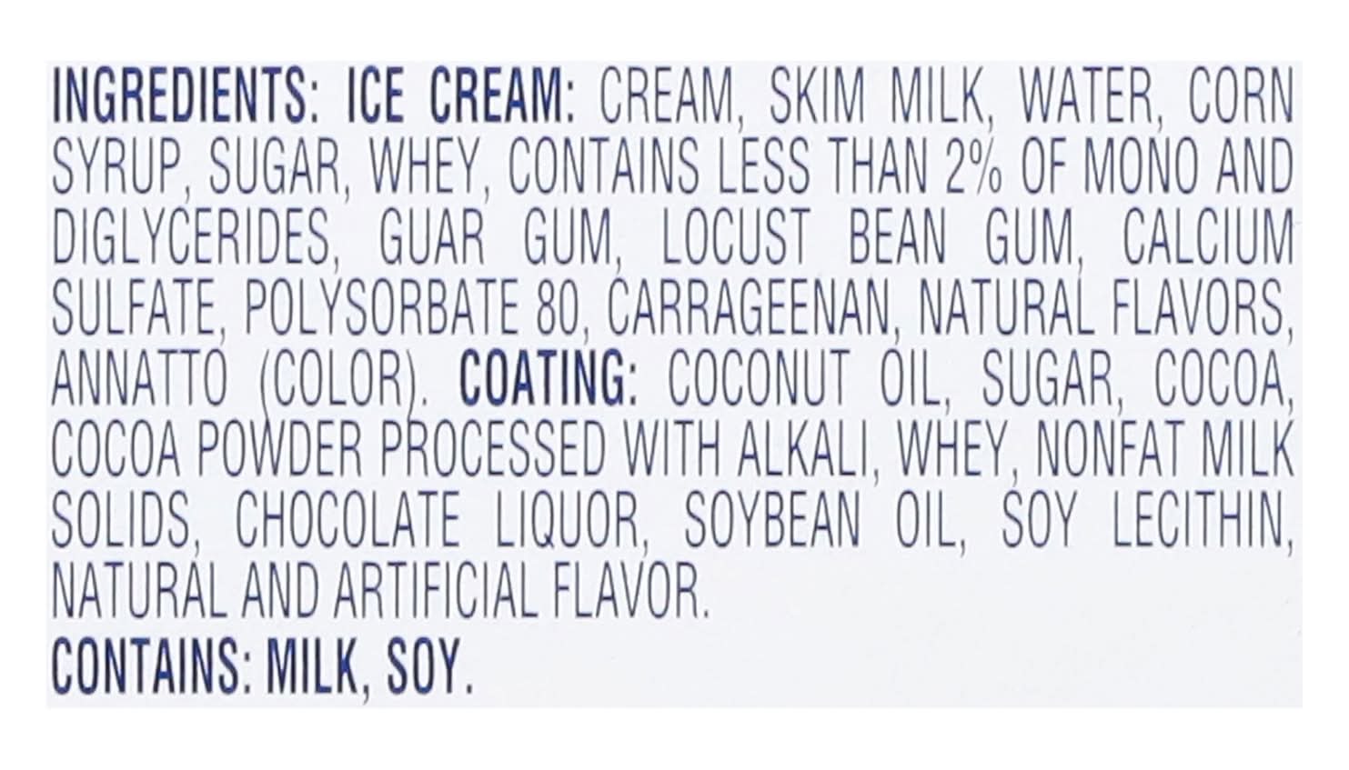 Ingredients: Ice Cream: Cream, Skim Milk, Water, Corn Syrup, Sugar, Whey, Contains Less than 2% of Mono and Diglycerides, Guar Gum, Locust Bean Gum, Calcium Sulfate, Polysorbate 80, Carrageenan, Natural Flavors, Annatto (Color). Coating: Coconut Oil, Sugar, Cocoa, Cocoa Powder Processed with Alkali, Whey, Nonfat Milk Solids, Chocolate Liquor, Soybean Oil, Soy Lecithin, Natural and Artificial Flavor Contains: Milk, Soybeans, Corn, Tree Nuts, Coconuts