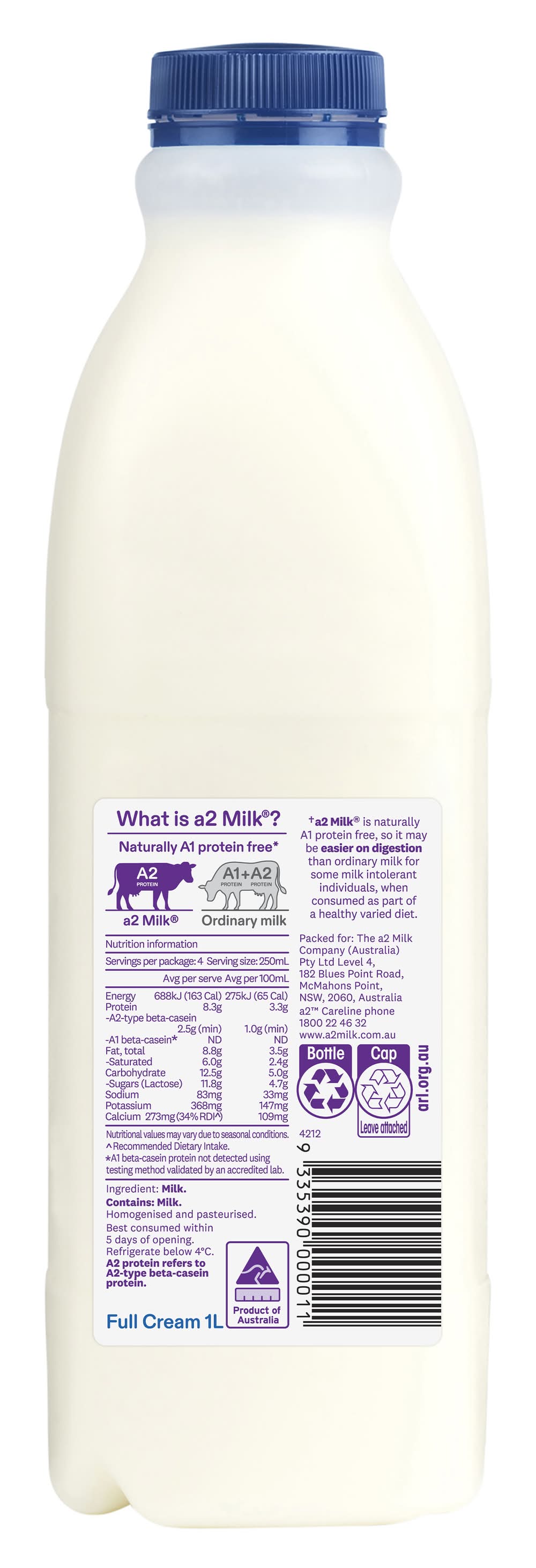 No ordinary milk It is real milk that may be easier on digestion for some people*. As the number 1 producer of of A1 protein free milk in Australia, our purpose is to pioneer the future of dairy for good. *a2 Milk comes from cows specially selected to naturally produce milk with only the A2-type beta-casein protein so may be easier on digestion than ordinary milk for some milk intolerant individuals when consumed as part of a healthy, varied diet. Packaging: Reusable