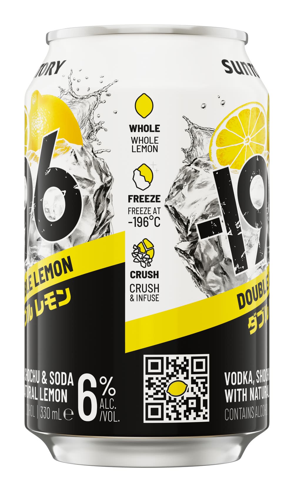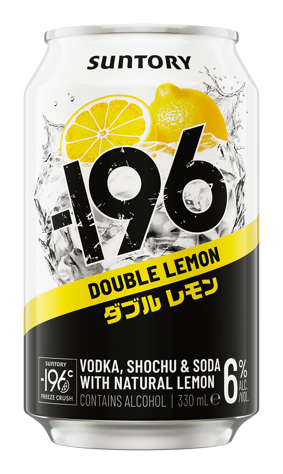 Suntory -196 Double Lemon is an alcoholic premix made from Shochu, Vodka and Soda. It uses Suntory’s unique Freeze Crush Technology to capture every bit of all-natural bold lemon flavour. Whole lemons are is frozen and crushed at -196°C, then infused in spirits to maintain that unique, full-fruit flavour. This is then added to Shochu, Vodka & Soda to bring to you Suntory -196 as you know it. Suntory -196 comes from Suntory's No.1 Premix brand in Japan Strong Zero. With 0.3 grams of sugar and only 122 calories per can, Suntory -196 Double Lemon • Flavor: Double lemon • Alcohol by volume: 6%