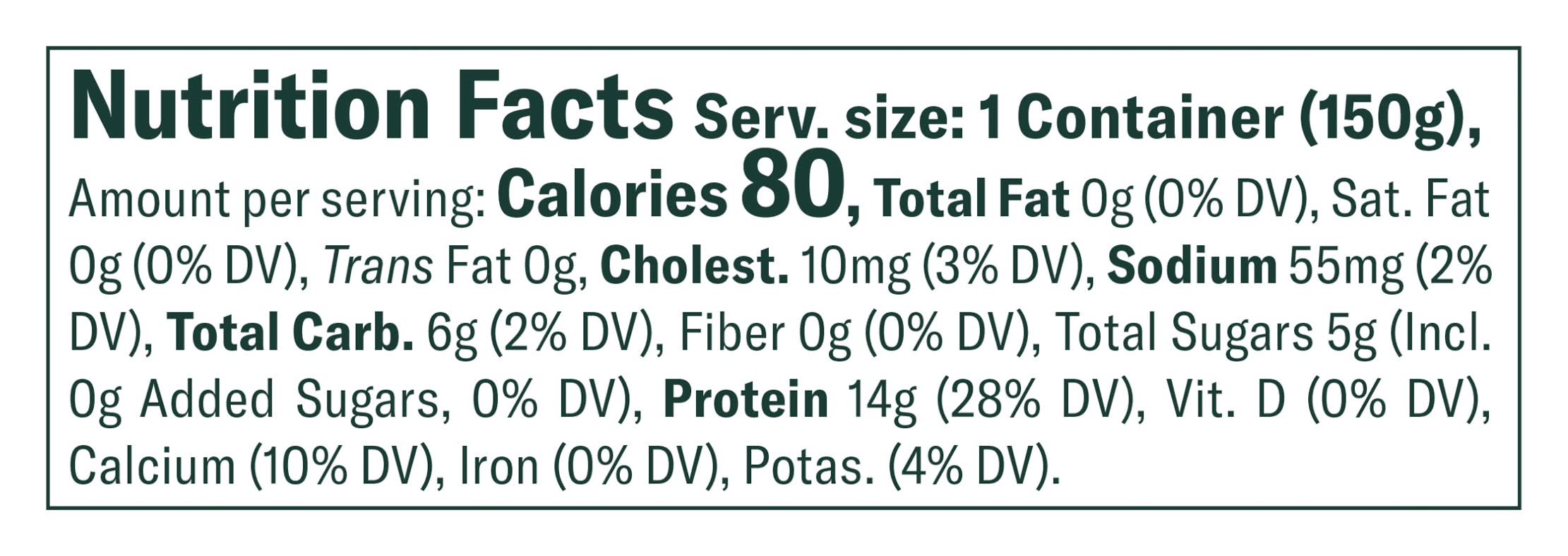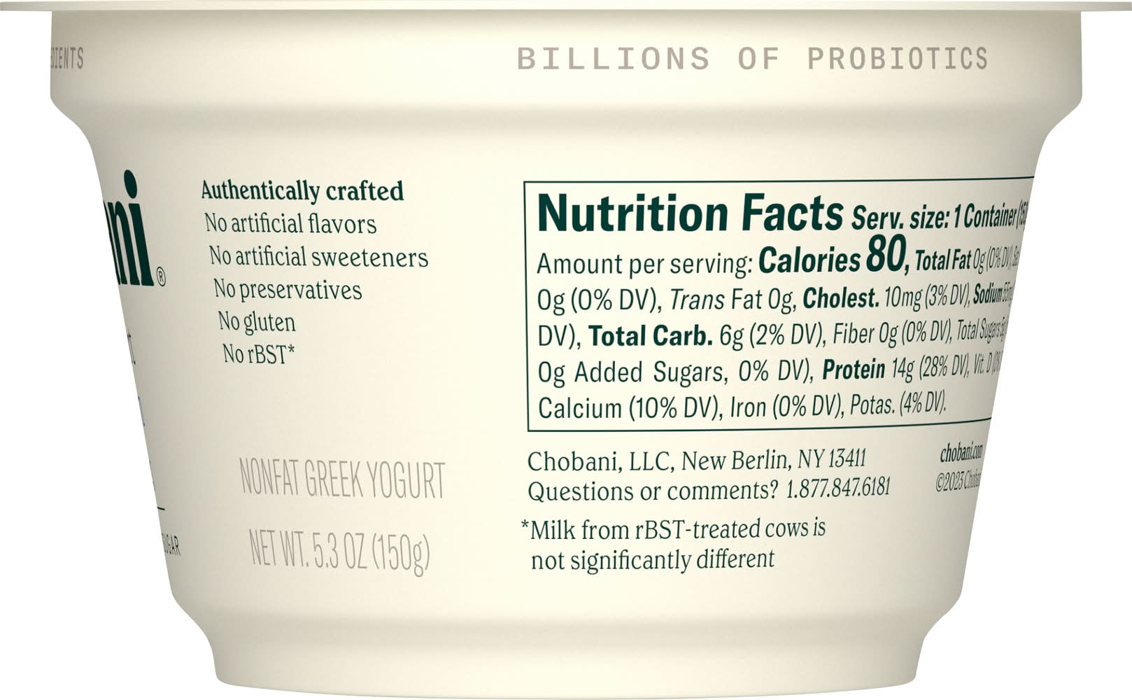 No artificial flavors. 14 g protein. 0 g added sugar. No gluten. 0% milkfat. Billion of probiotics. Protein rich. Nonfat. Authentically Crafted: No artificial sweeteners. No preservatives. Tear off label and recycle cup. • Chobani, LLC, New Berlin, NY 13411 • Packaging: Reusable