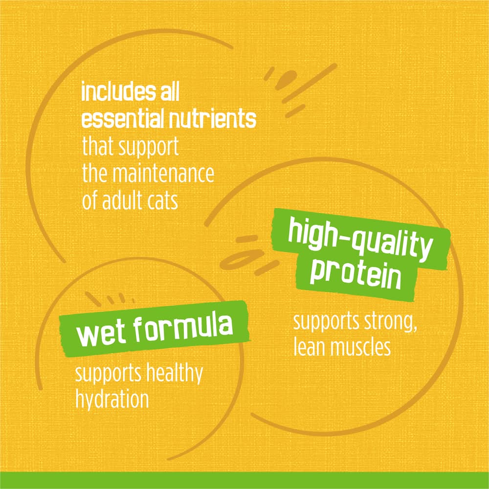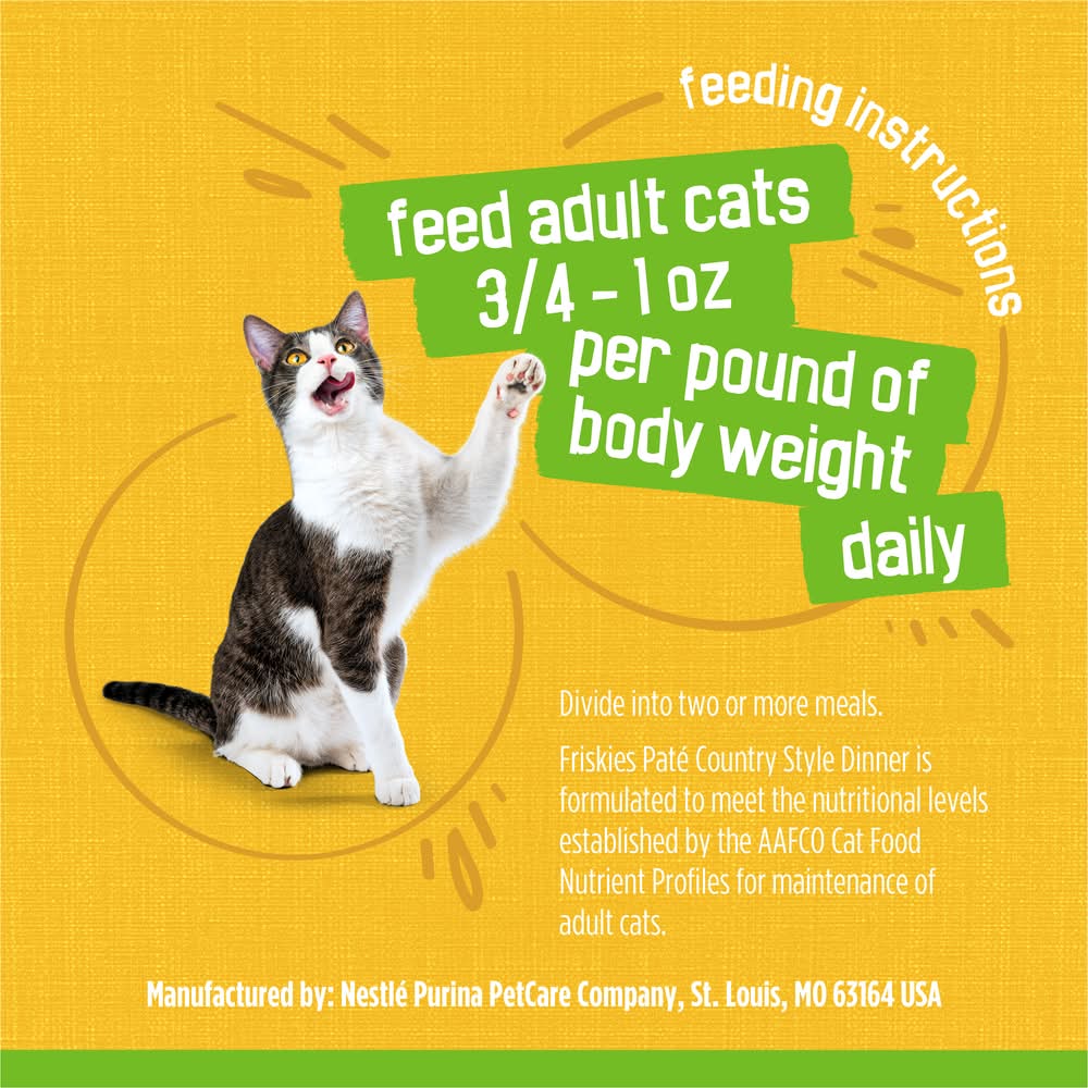 Give your cat an entree she’s sure to love food with . The savory chicken flavor brings classic yummy goodness to her dish, and the smooth wet pate cat food pleases her palate and adds healthy hydration from her first bite to her very last nibble that something truly delicious awaits her at mealtime. Watch her delight in the delectable of adult cats in every serving with no artificial colors or preservatives. The combination of taste, texture and aroma makes this canned cat food meal a feast for her senses, keeping your cat excited about the food you put in her dish. Serve this Purina Friskies canned cat food pate to your cat today and show her that she's a beloved member of your family. • Nestle Purina Petcare, St. Louis, MO, 63164 • Packaging: Reusable