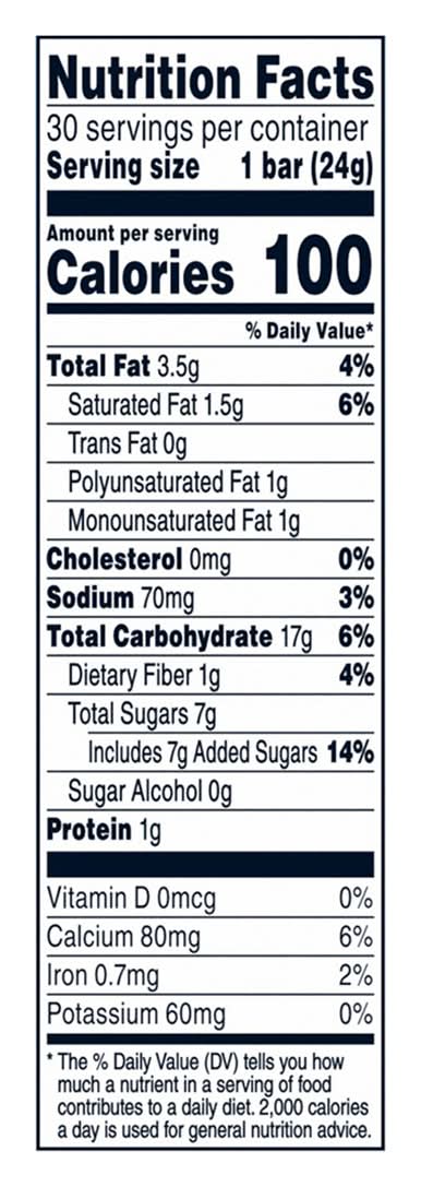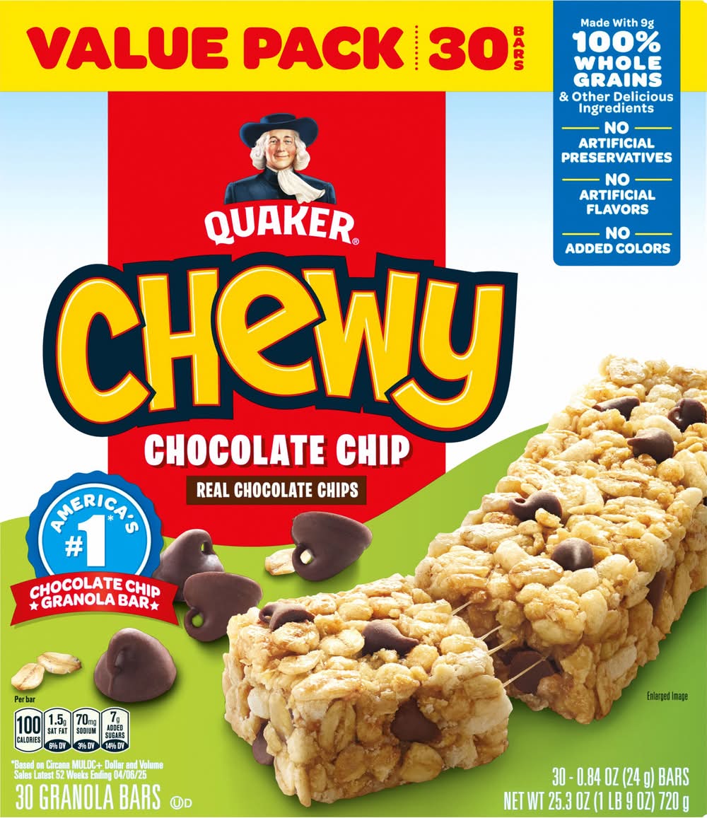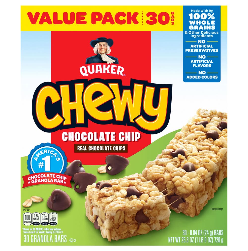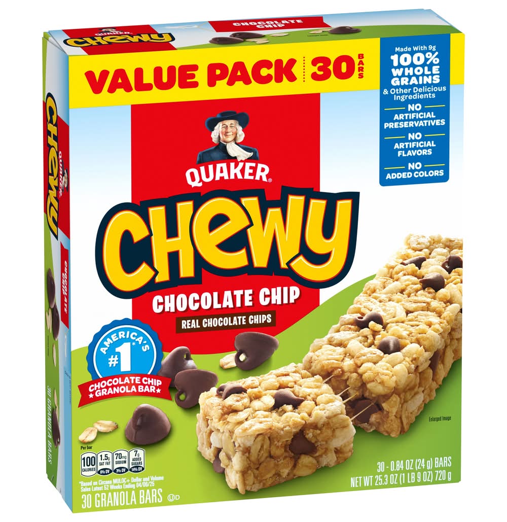 100% whole grains among other ingredients. A single serving provides 9 grams of whole grains, making up over 50% of the grain content. These granola bars are free from artificial flavors, preservatives, and added colors, offering a wholesome snacking option. • Flavor: Chocolate chip • Pack size: 30 • The Quaker Oats Company, PO Box 049003, Chicago, IL