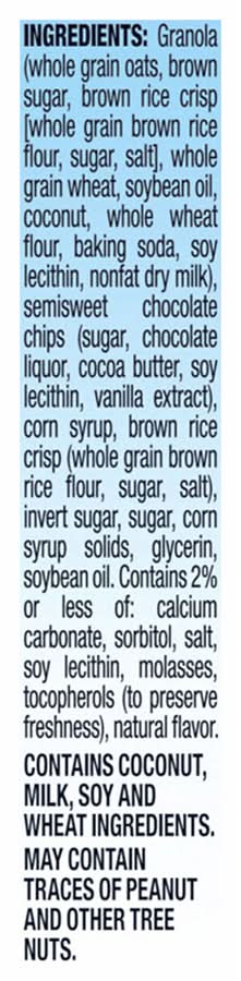 Ingredients: Granola (Whole Grain Oats, Brown Sugar, Brown Rice Crisp [Whole Grain Brown Rice Flour, Sugar, Salt], Whole Grain Wheat, Soybean Oil, Coconut, Whole Wheat Flour, Baking Soda, Soy Lecithin, Nonfat Dry Milk), Semisweet Chocolate Chips (Sugar, Chocolate Liquor, Cocoa Butter, Soy Lecithin, Vanilla Extract), Corn Syrup, Brown Rice Crisp (Whole Grain Brown Rice Flour, Sugar, Salt), Invert Sugar, Sugar, Corn Syrup Solids, Glycerin, Soybean Oil. Contains 2% or Less of: Calcium Carbonate, Sorbitol, Salt, Soy Lecithin, Molasses, Tocopherols (to Preserve Freshness), Natural Flavor Contains: Milk, Soybeans, Wheat, Oat, Coconuts, Peanuts, Tree Nuts