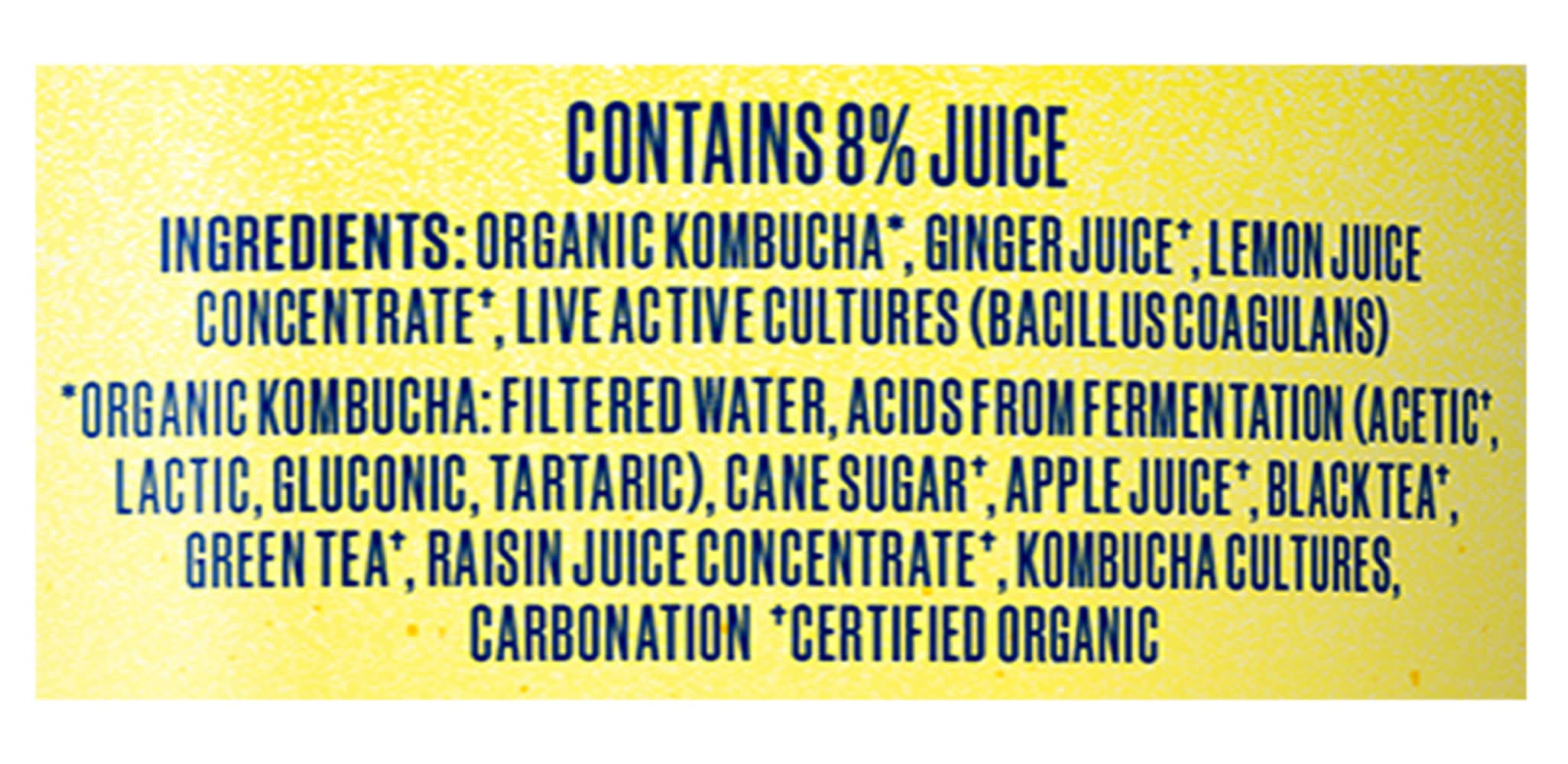 Ingredients: Organic Kombucha*, Ginger Juice(a), Lemon Juice Concentrate(a), Live Active Cultures (Bacillus Coagulans). * Organic Kombucha: Filtered Water, Acids from Fermentation (Acetic(a), Lactic, Gluconic, Tartaric), Cane Sugar(a), Apple Juice(a), Black Tea(a), Green Tea(a), Raisin Juice Concentrate(a), Kombucha Cultures, Cabonation. (a) Certified Organic