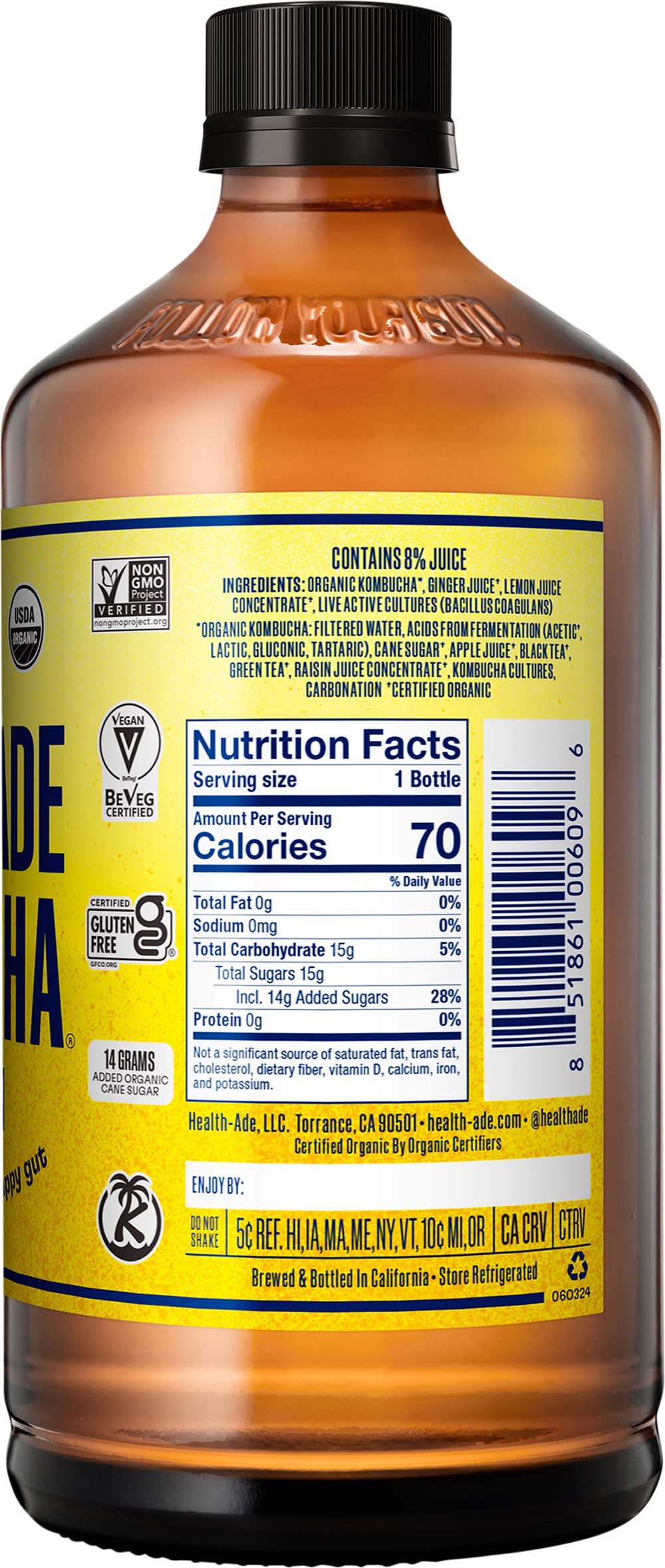 Say hello to more feel-good-gut days! Every bottle of Health-Ade Kombucha combines thirst-quenching, organic juice with the living probiotics of fermented tea for a bubbly treat that's also good for your gut. You're sips away from a healthier gut and a happier you! Follow your gut! • Flavor: Ginger-lemon • Health-Ade, LLC., Torrance,CA,90501 • Packaging: Reusable