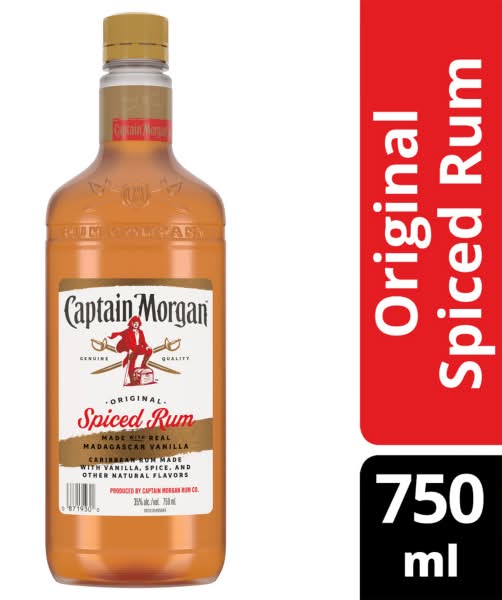 Captain Morgan Original Spiced Rum is a distinctive spirit with a secret blend that delivers a medium-bodied taste. Its flavor profile includes subtle notes of vanilla and caramel, culminating in a flavorful finish. Each 1.5 oz serving contains approximately 86 calories and less than 1 gram of sugar. The rum is presented in a 750ml plastic bottle and contains a 70 proof level. It is designed to complement a variety of mixers for a versatile drinking experience. Drink responsibly. Alcohol by volume: 35%