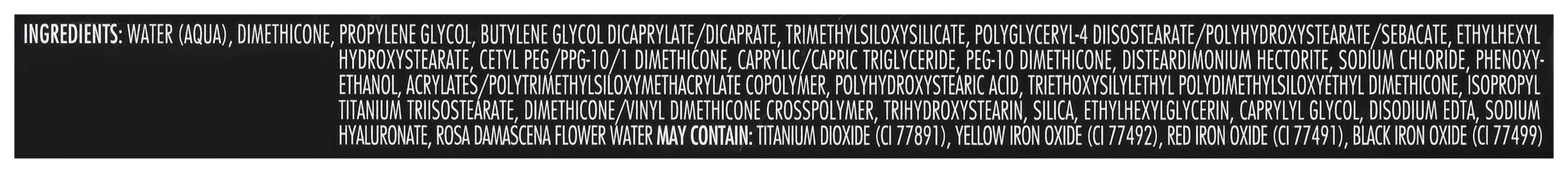 Ingredients: Water (Aqua), Dimethicone, Propylene Glycol, Butylene Glycol Dicaprylate/Dicaprate, Trimethylsiloxysilicate, Polyglyceryl-4 Diisostearate/Polyhydroxystearate/Sebacate, Ethylhexyl Hydroxystearate, Cetyl PEG/PPG-10/1 Dimethicone, Caprylic/Capric Triglyceride, PEG-10 Dimethicone, Disteardimonium Hectorite, Sodium Chloride, Phenoxyethanol, Acrylates/Polytrimethylsiloxymethacrylate Copolymer, Polyhydroxystearic Acid, Triethoxysilylethyl Polydimethylsiloxyethyl Dimethicone, Isopropyl Titanium Triisostearate, Dimethicone/Vinyl Dimethicone Crosspolymer, Trihydroxystearin, Silica, Ethylhexylglycerin, Caprylyl Glycol Disodium EDTA, Sodium Hyaluronate, Rosa Damascena Flower Water May Contain: Titanium Dioxide (CI 77891), Yellow Iron Oxide (CI 77492), Red Iron Oxide (CI 77491), Black Iron Oxide (CI 77499)