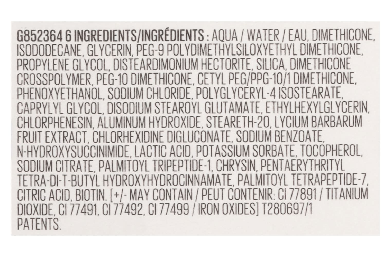 Ingredients: G852364 6: Aqua/Water/Eau, Dimethicone, Isododecane, Glycerin, PEG-9 Polydimethylsiloxyethyl Dimethicone, Propylene Glycol, Disteardimonium Hectorite, Silica, Dimethicone, Crosspolymer, PEG-10 Dimethicone, Cetyl PEG/PPG-10/1 Dimethicone, Phenoxyethanol, Sodium Chloride, Polyglyceryl-4 Isostearate, Caprylyl Glycol, Disodium Stearoyl Glutamate, Ethylhexylglycerin, Chlorphenesin, Aluminum Hydroxide, Steareth-20, Lycium Barbarum Fruit Extract, Chlorhexidine Digluconate, Sodium Benzoate, N-Hydroxysuccinimide, Lactic Acid, Potassium Sorbate, Tocopherol, Sodium Citrate, Palmitoyl Tripeptide-1, Chrysin, Pentaerythrityl Tetra-Di-T-Butyl Hydroxyhydrocinnamate, Palmitoyl Tetrapeptide-7, Citric Acid, Biotin. [+/- May Contain: CI77891/Titanium Dioxide, CI 77491, CI 77492, CI 77492, CI 77499/Iron Oxides]. T280697/1