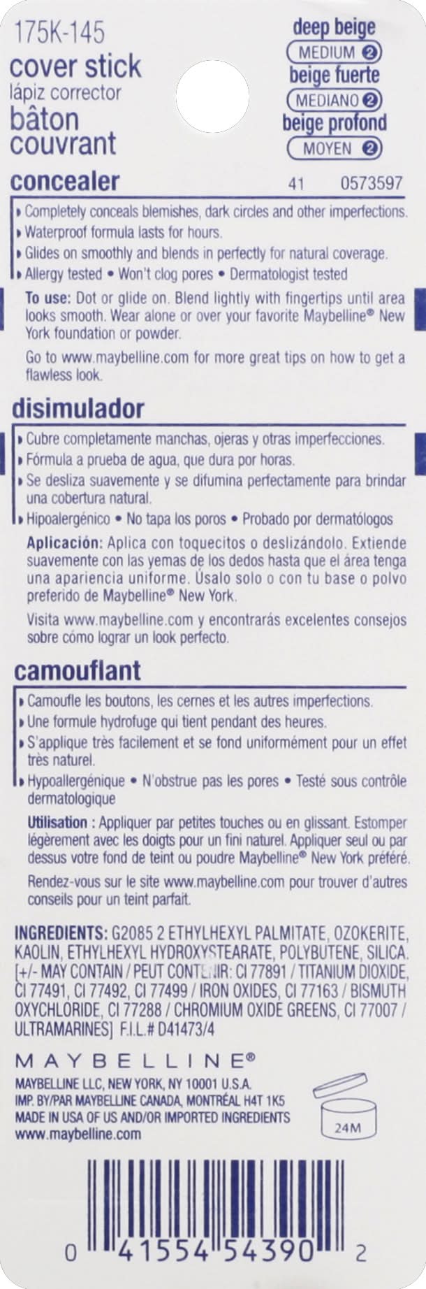 Concealer, Cover Stick, Deep Beige 145 Maybelline New York, New York, NY 10017