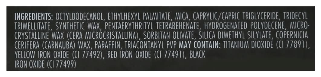 Ingredients: Octyldodecanol, Ethylhexyl Palmitate, Mica, Caprylic/Capric Triglyceride, Tridecyl Trimellitate, Synthetic Wax, Pentaerythrityl Tetrabehenate, Hydrogenated Polydecene, Microcrystalline Wax (Cera Microcristallina), Sorbitan Olivate, Silica Dimethyl Silylate, Copernicia Cerifera (Carnauba) Wax, Paraffin, Triacontanyl PVP. May Contain: Titanium Dioxide (CI 77891), Yellow Iron Oxide (CI 77492), Red Iron Oxide (CI 77491), Black Iron Oxide (CI 77499)