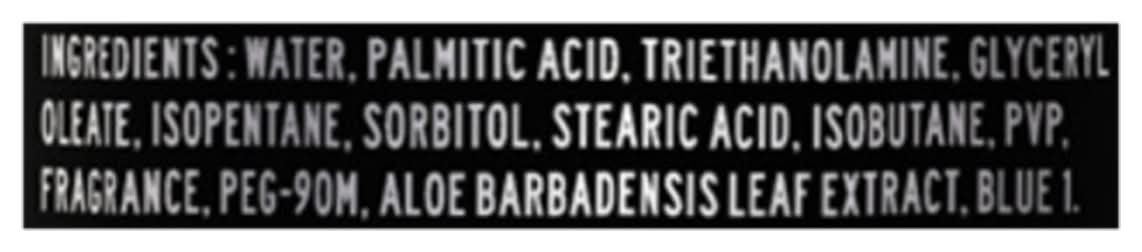 Ingredients: Water, Palmitic Acid, Triethanolamine, Glyceryl Oleate, Isopentane, Sorbitol, Stearic Acid, Isobutane, PVP, Fragrance, PEG-90M, Aloe Barbadensis Leaf Extract, Blue 1