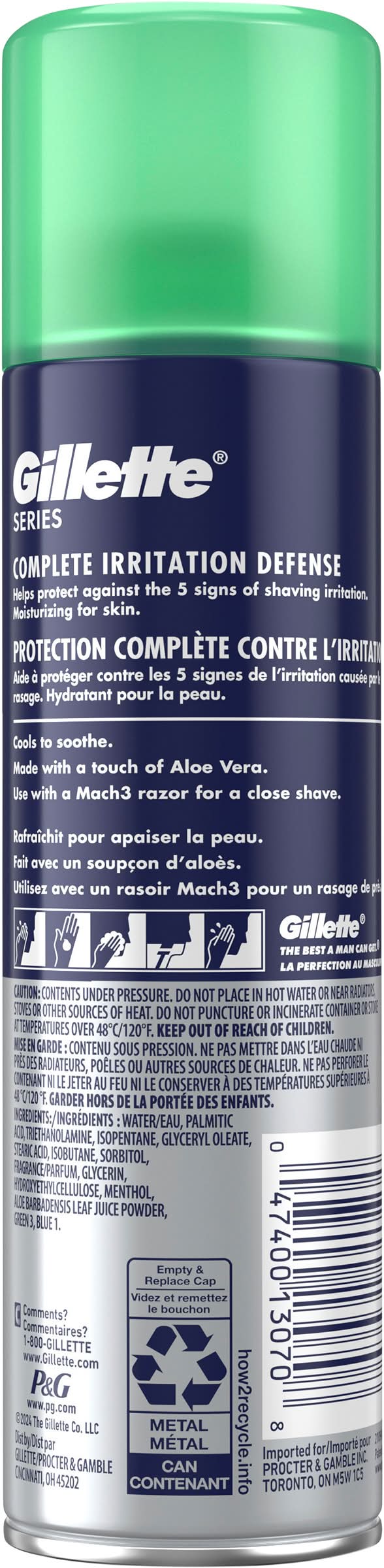 Ingredients: Water/Eau, Palmitic Acid, Triethanolamine, Isopentane, Glyceryl Oleate, Stearic Acid, Isobutane, Sorbitol, Fragrance/Parfum, Glycerin, Hydroxyethylcellulose, Menthol, Aloe Barbadensis Leaf Juice Powder, Green 3, Blue 1