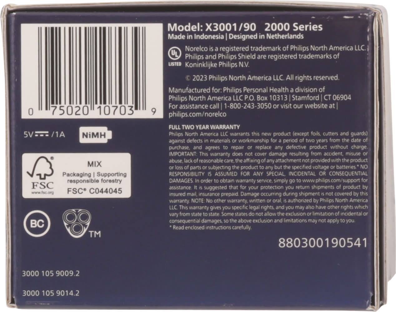 Comfort Cut blades are engineered for a consistent clean shave. Wet and dry. 40 minute run time. Pop-up trimmer. Skin Protect technology. Comfortable, clean shave. 4D Flex Heads: The shaver heads flex and float in 4 directions, adjusting to the curves of your face for smooth skin contact without a lot of pressure. Anti-corrosion blades. Comfort Cut Blades: Get a clean, comfortable shave. Rounded blade caps shield 27 self-sharpening blades to gently cut hair just above skin level. Pop-Up Trimmer: Finish your look with the built-in trimmer. It's ideal for maintaining your mustache and trimming your sideburns. Use Wet or Dry: Safe to use with or without shaving creams and gels. Powerful Battery: Up to 40 minutes of cordless shaving after 1 hour charge. 5- minute quick charge gives enough power for one shave. Battery Indicator: Light signals when battery is full, low or charging. One-Touch Open: Shaver head flips open for easy cleaning. Anti-slip rubber grip. Replacement Heads: For best results, replace shaving heads every 12 months. Use SH30 replacement heads, sold separately. 2 year warranty. Risk-free trial: 45-day money-back guarantee. Full Two Year Warranty: Philips North America LLC warrants this new product (except foils, cutters and guards) against defects in materials or workmanship for a period of two years from the date of purchase, and agrees to repair or replace any defective product without charge. Important: this warranty does not cover damage resulting from accident, misuse or abuse, lack of reasonable care, the affixing of any attachment not provided with the product or loss of parts or subjecting the product to any but the specified voltage or batteries (read enclosed instructions carefully). No responsibility is assumed for any special, incidental or consequential damages. In order to obtain warranty service, Damage occurring during shipment is not covered by this warranty. Note: no other warranty, written or oral, is authorized by Philips North America LLC. This warranty gives you specific legal rights, and you may also have other rights which vary from state to state. Some states do not allow the exclusion or limitation of incidental or consequential damages, so the above exclusion and limitations may not apply to you.