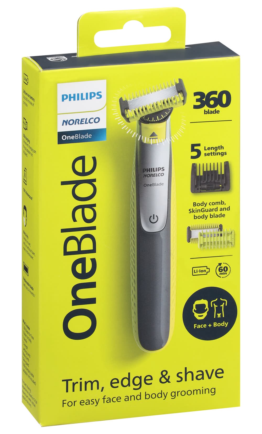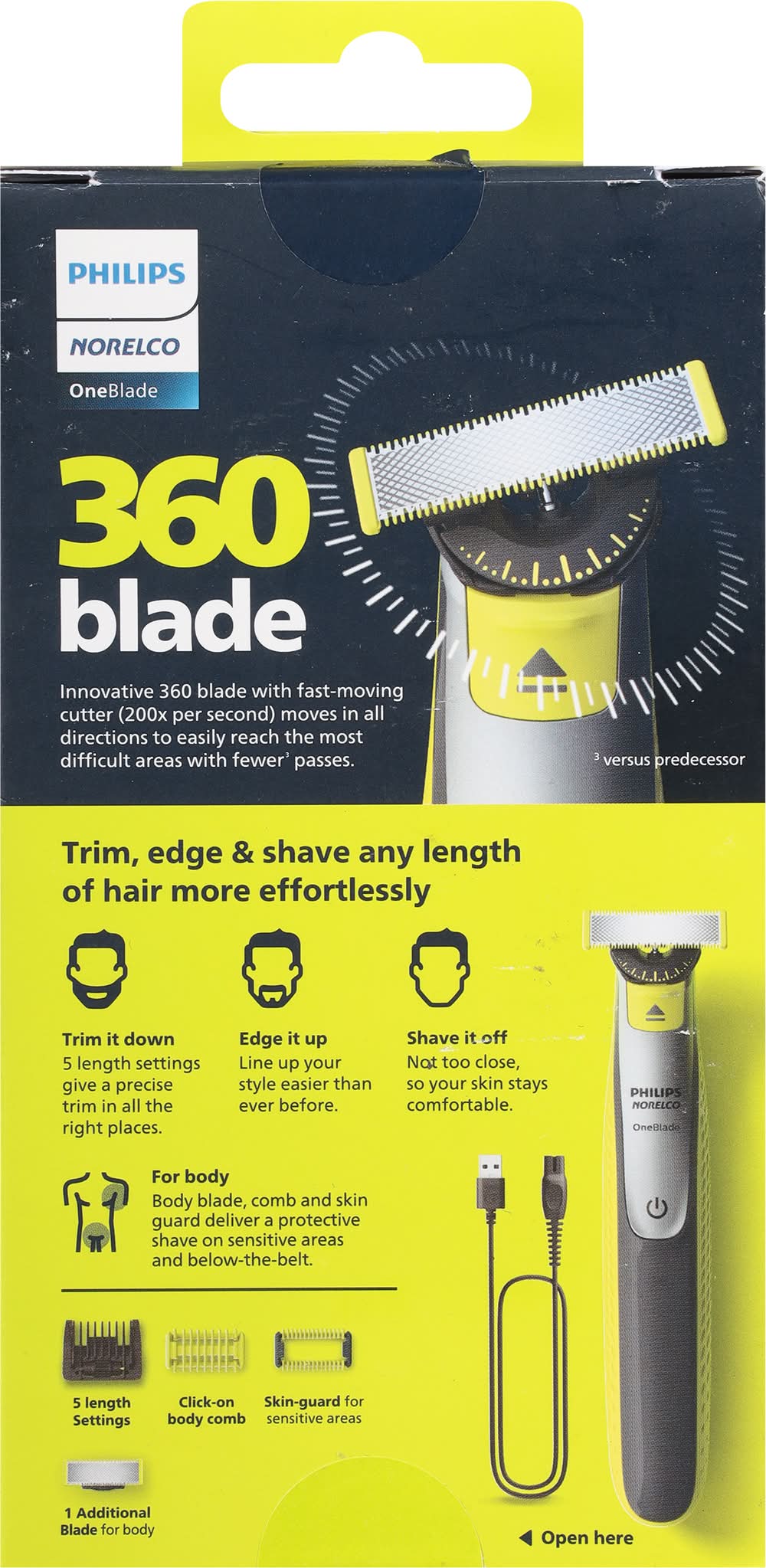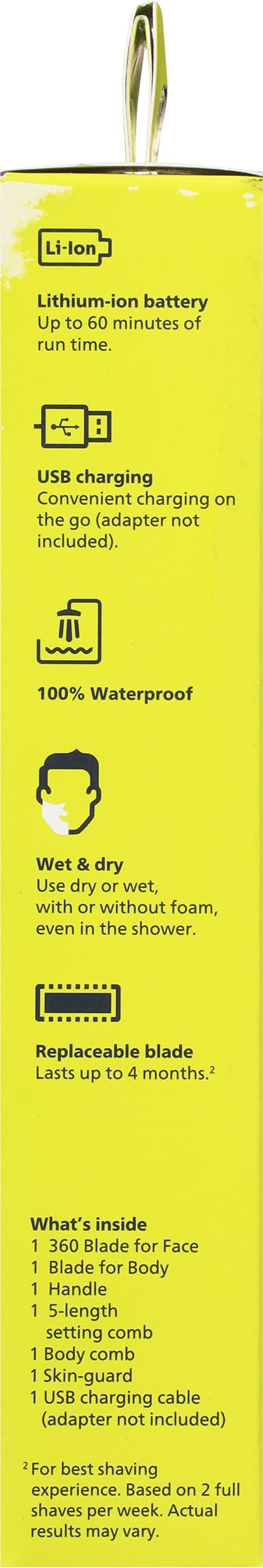 What's Inside: 1 - 360 Blade for Face; 1-Blade for Body; 1 Handle; 1 - 5-Length Setting Comb; 1 Body Comb; 1 Skin-Guard; 1 USB Charging Cable (adapter not included). 360 blade. 5 length settings. Body comb, skinguard and body blade. Li-Ion. 60 min. Face + body. For easy face and body grooming. Lithium-ion battery Up to 60 minutes of run time. USB charging: Convenient charging on the go 100% Waterproof. Wet & dry: Use dry or wet, with or without foam, even in the shower. Replaceable blade lasts up to 4 months (For best shaving experience. Based on 2 full shaves per week. Actual results may vary). Innovative 360 blade with fast-moving cutter (200x per second) moves in all directions to easily reach the most difficult areas with fewer (versus predecessor) passes. Trim, edge & shave any length of hair more effortlessly. Trim it down: 5 length settings give a precise trim in all the right places. Edge it up: Line up your style easier than ever before. Shave it off: Not too close, so your skin stays comfortable. For Body: Body blade, comb and skin guard deliver a protective shave on sensitive areas and below-the-belt. 5 length setting. Click-on body comb. Skin-guard for sensitive areas. 1 Additional Blade for body. 45 day risk free trial. Color: Black-white