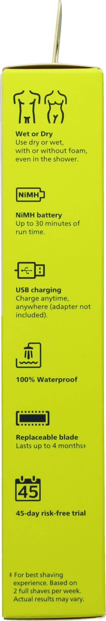 Contour-following technology. Dual protection system. For any length of hair. Comes with skin protector and trimming comb. 8 hours on a full charge. Ribbed rubber grip.