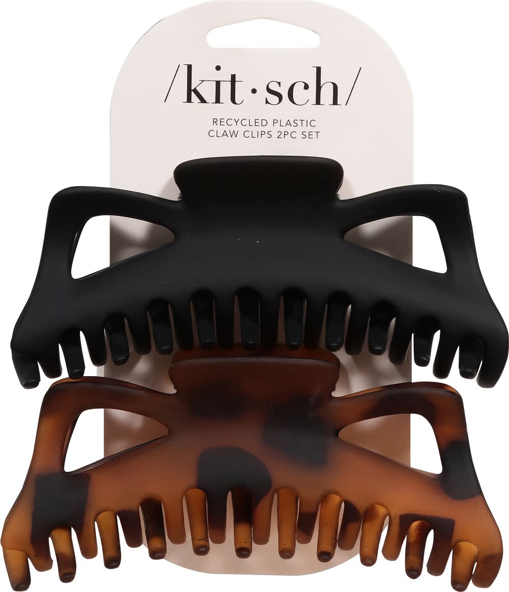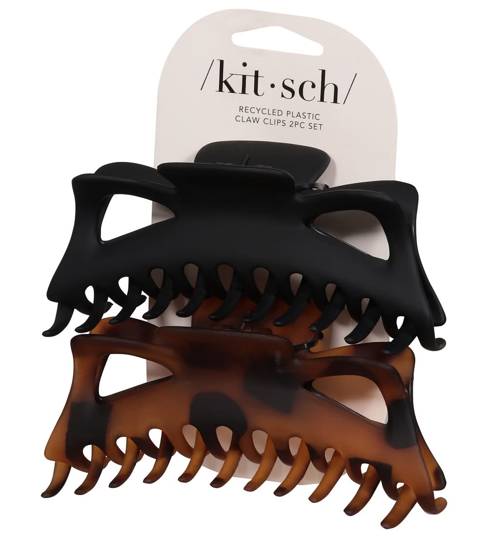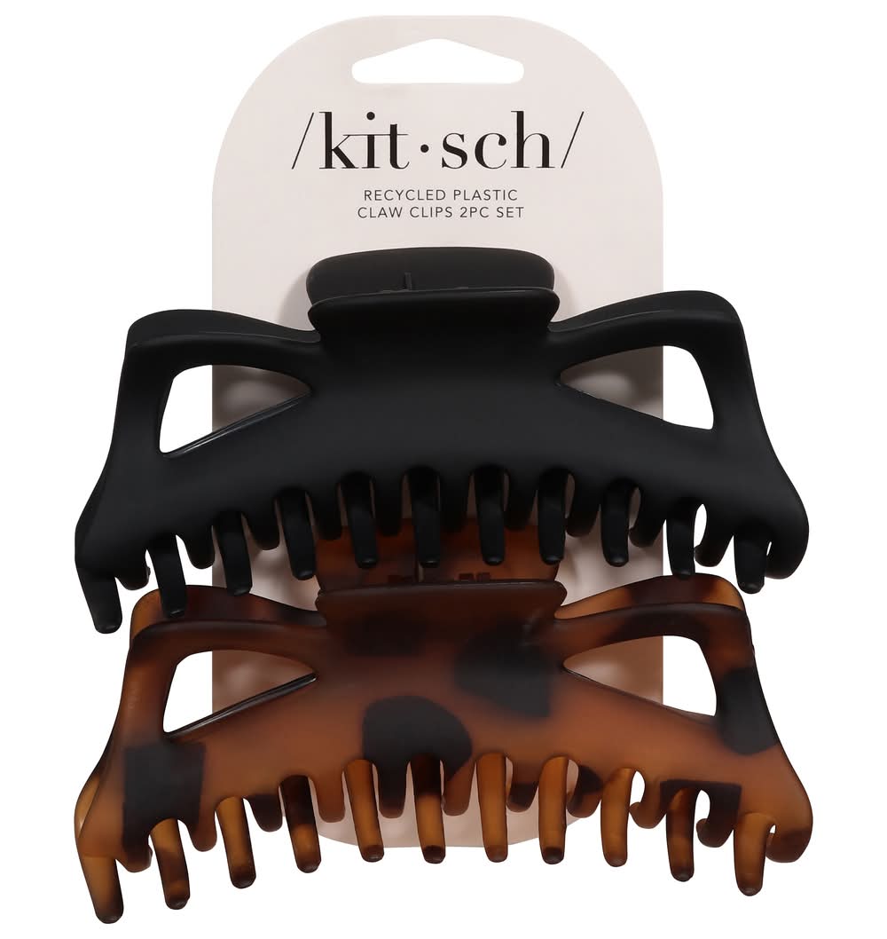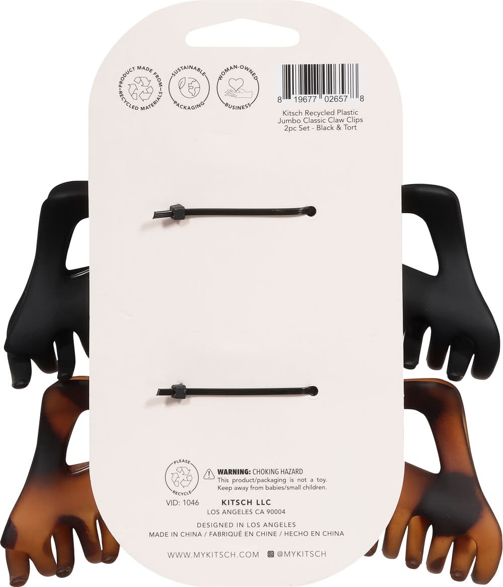 Kitsch Jumbo Claw Clips are the perfect way to elevate your everyday essentials! Consciously created from recycled materials, the stylish design is perfect for pinning up your hair with the added bonus of reducing plastic waste. Have the peace of mind that these clips are kind on the environment and your hair, all while looking chic!Each clip measures 14cm length, 6cm height, 4.5cm width • Color: Black-tortoise • Packaging: Reusable