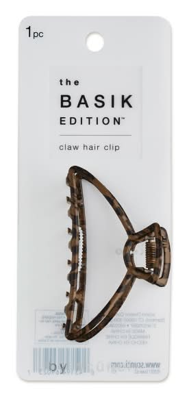 Crafted from metal, the Basik Edition Claw Hair Clip is adorned with a striking leopard print design. This accessory is engineered to hold hair securely, thanks to its easy-to-use hinge mechanism that opens widely when pinched. It accommodates a variety of hair types and textures. Additionally, it is offered in a blond tortoise finish.