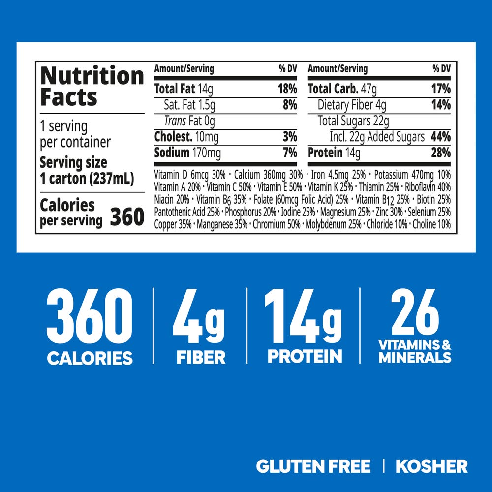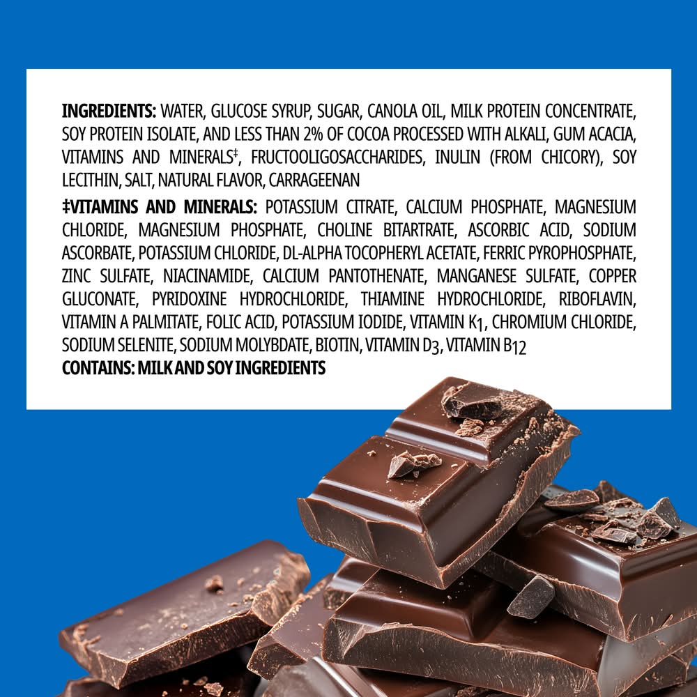 Ingredients: WATER, GLUCOSE SYRUP, SUGAR, CANOLA OIL, MILK PROTEIN CONCENTRATE, SOY PROTEIN ISOLATE, AND LESS THAN 2% OFCOCOA PROCESSED WITH ALKALI, GUM ACACIA, VITAMINS AND MINERALS*, FRUCTOOLIGOSACCHARIDES, INULIN (FROM CHICORY), SOY LECITHIN, SALT, NATURAL FLAVOR, CARRAGEENAN *VITAMINS AND MINERALS: POTASSIUM CITRATE, CALCIUM PHOSPHATE, MAGNESIUM CHLORIDE, MAGNESIUM PHOSPHATE, CHOLINE BITARTRATE, ASCORBIC ACID, SODIUM ASCORBATE, POTASSIUM CHLORIDE, DL-ALPHA TOCOPHERYL ACETATE, FERRIC PYROPHOSPHATE, ZINC SULFATE, NIACINAMIDE, CALCIUM PANTOTHENATE, MANGANESE SULFATE, COPPER GLUCONATE, PYRIDOXINE HYDROCHLORIDE, THIAMINE HYDROCHLORIDE, RIBOFLAVIN, VITAMIN A PALMITATE, FOLIC ACID, POTASSIUM IODIDE, VITAMIN K1, CHROMIUM CHLORIDE, SODIUM SELENITE, SODIUM MOLYBDATE, BIOTIN, VITAMIN D3, VITAMIN B12, (Insert Rainforest Alliance Logo), Cocoa, Rainforest Alliance Certified Cocoa. Find out more at ra.org. Contains: CONTAINS: MILK AND SOY INGREDIENTS