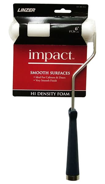 Linzer 6in High Density Foam Mini Roller W/Frame is a mini roller that comes complete with a frame, specifically designed for smaller projects and tight, confined spaces. It features high-density foam, making it suitable for use on any smooth surface and ideal with gloss paints. This roller is particularly effective for painting kitchen cabinets and metal doors.