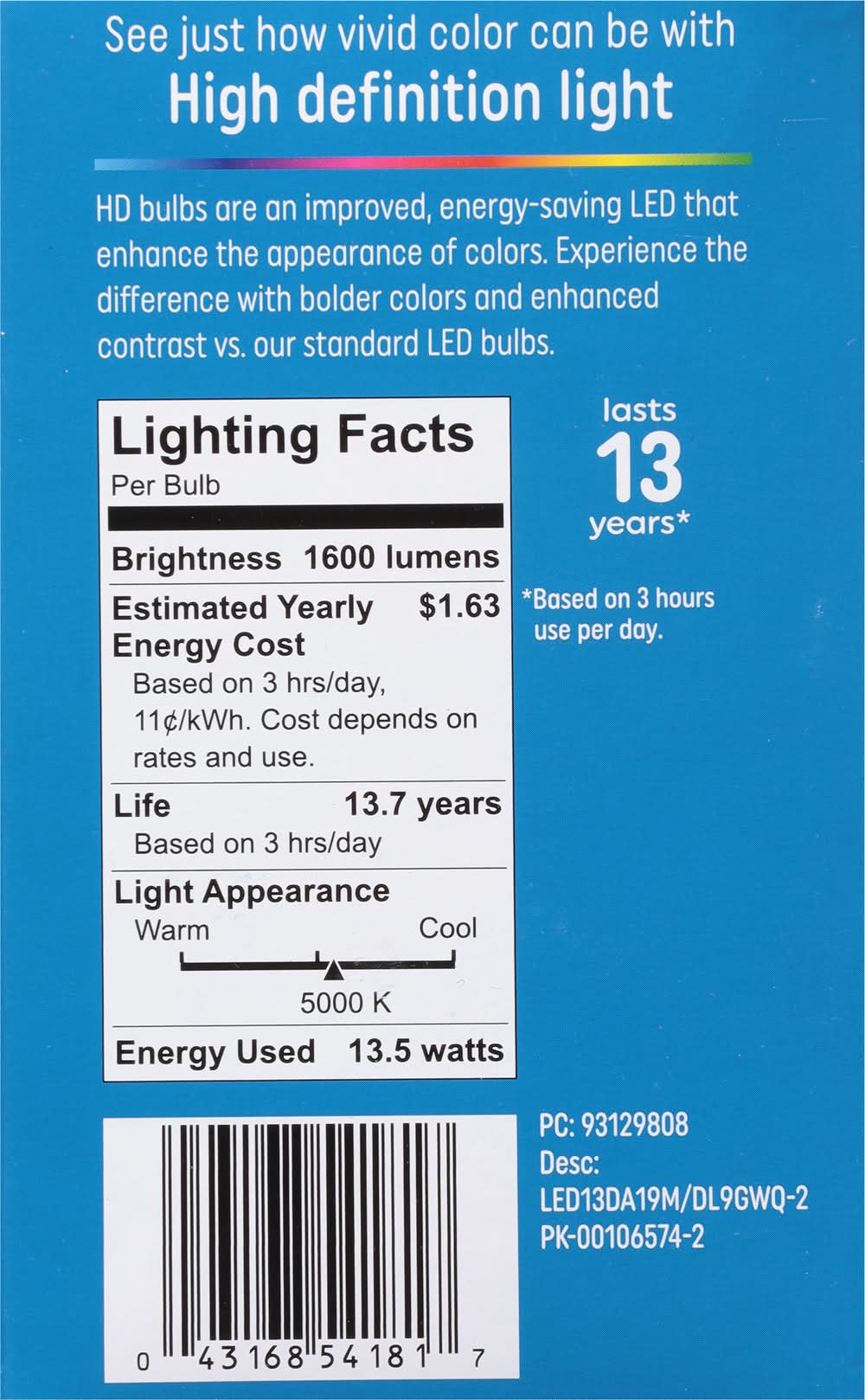 Light Bulbs, LED A19, HD Light, 13.5 Watts