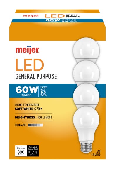 Meijer Led 9.5w A19 Dimmable Light Bulb, Soft White, 60w Equivalent