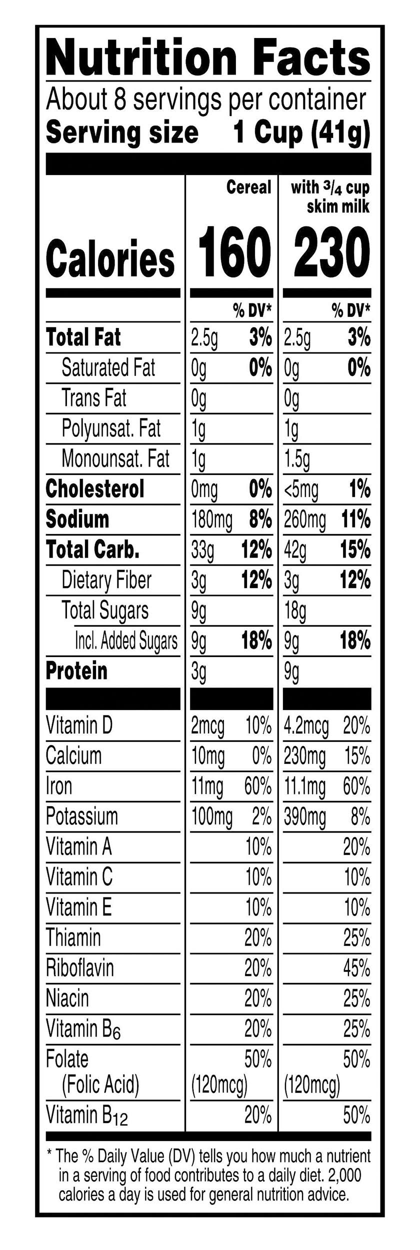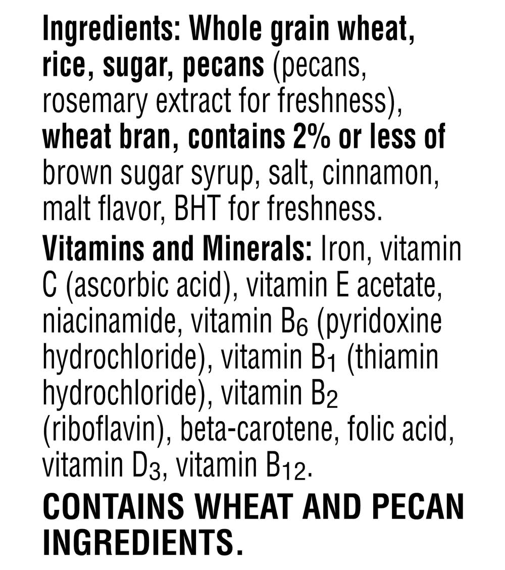 Ingredients: Whole Grain Wheat, Rice, Sugar, Pecans (Pecans, Rosemary Extract for Freshness), Wheat Bran, Contains 2% or Less of Brown Sugar Syrup, Salt, Cinnamon, Malt Flavor, BHT for Freshness. Vitamins and Minerals: Iron, Vitamin C (Ascorbic Acid), Vitamin E Acetate, Niacinamide, Vitamin B6 (Pyridoxine Hydrochloride), Vitamin B1 (Thiamin Hydrochloride), Vitamin B2 (Riboflavin), Beta-Carotene, Folic Acid, Vitamin D3, Vitamin B12 Contains: Wheat, Tree Nuts, Pecans