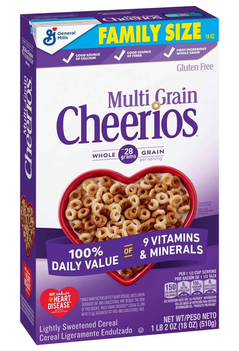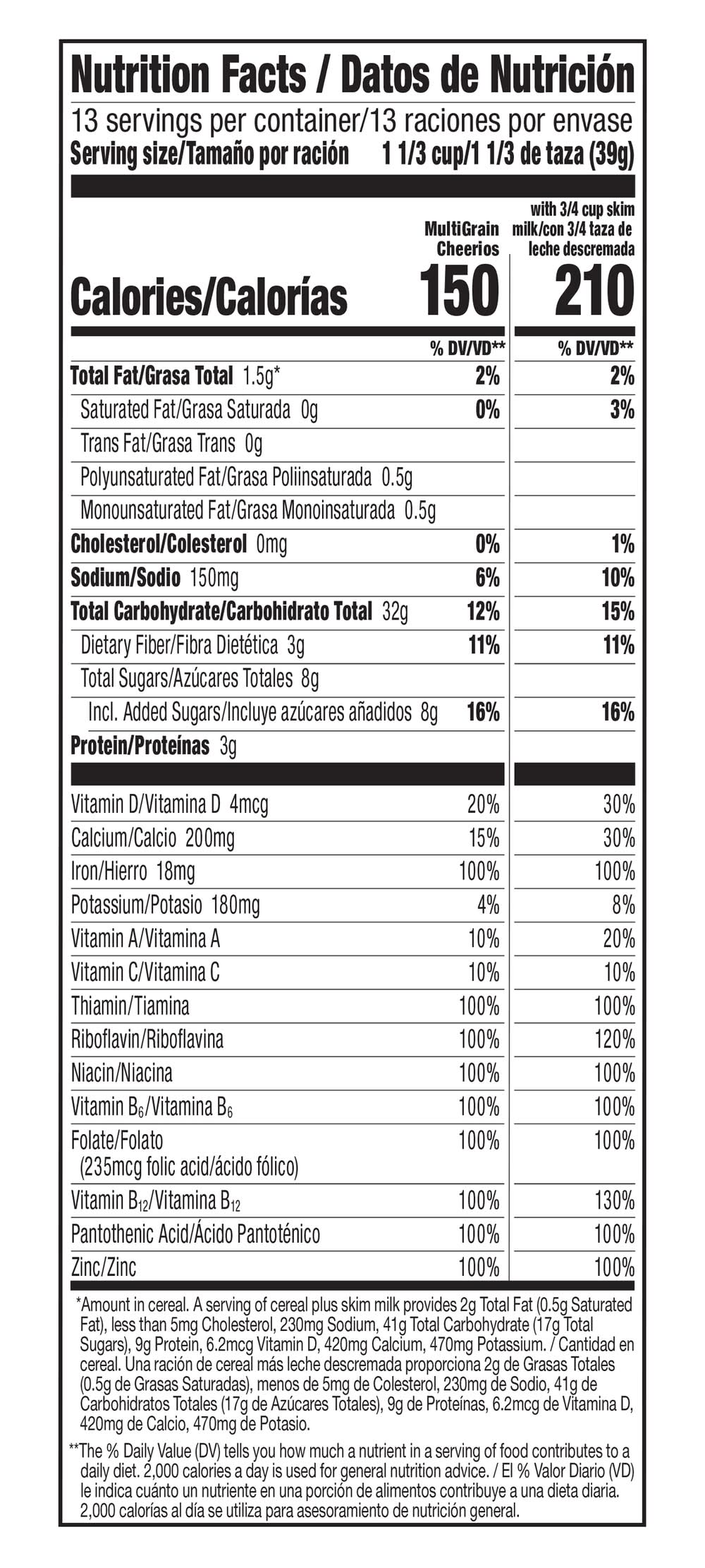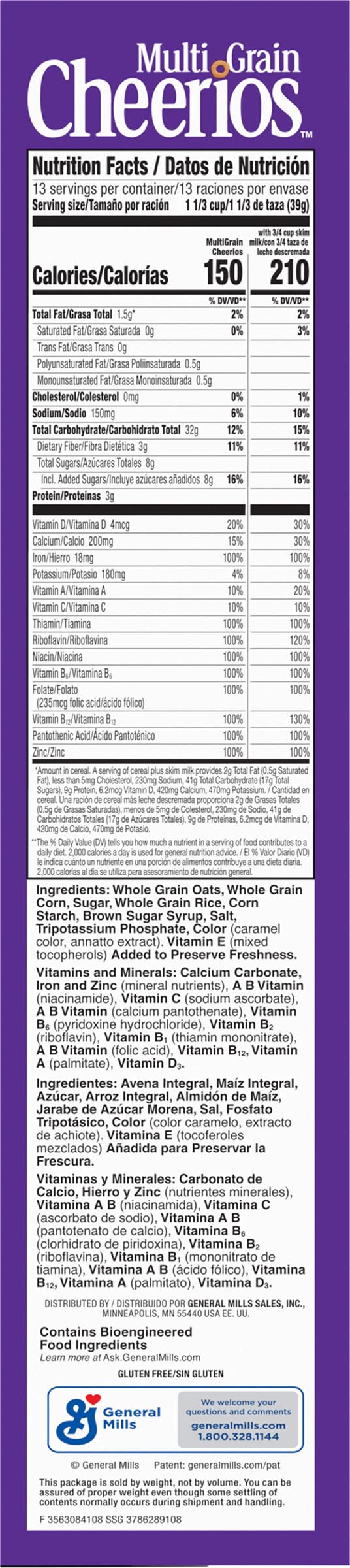 A whole grain food is made by using all three parts of the grain. Good source of calcium. Good source of fiber. 100% daily value of 9 vitamins & minerals. See nutrition facts for as prepared information. Contains bioengineered food ingredients. No colors from artificial sources. A whole grain food is made by using all three parts of the grain. What's so great about whole grain? With energy from whole grain, starting your morning with a bowl. With energy from whole grain, a bowl of multi grain Cheerios can help you: Plant a garden. Go for a bike ride. Sing as loud as you can. Have a dance party. Multi grain Cheerios also has 100% daily value of 9 essential vitamins and minerals (Multi grain Cheerios provides 100% daily value of 9 vitamins and minerals needed in the diet) like: Zinc which helps in the proper healing of wounds; Thiamin which helps promote normal energy metabolism; Iron which carries oxygen through the body General Mills Sales, Inc., Minneapolis, MN, 55440