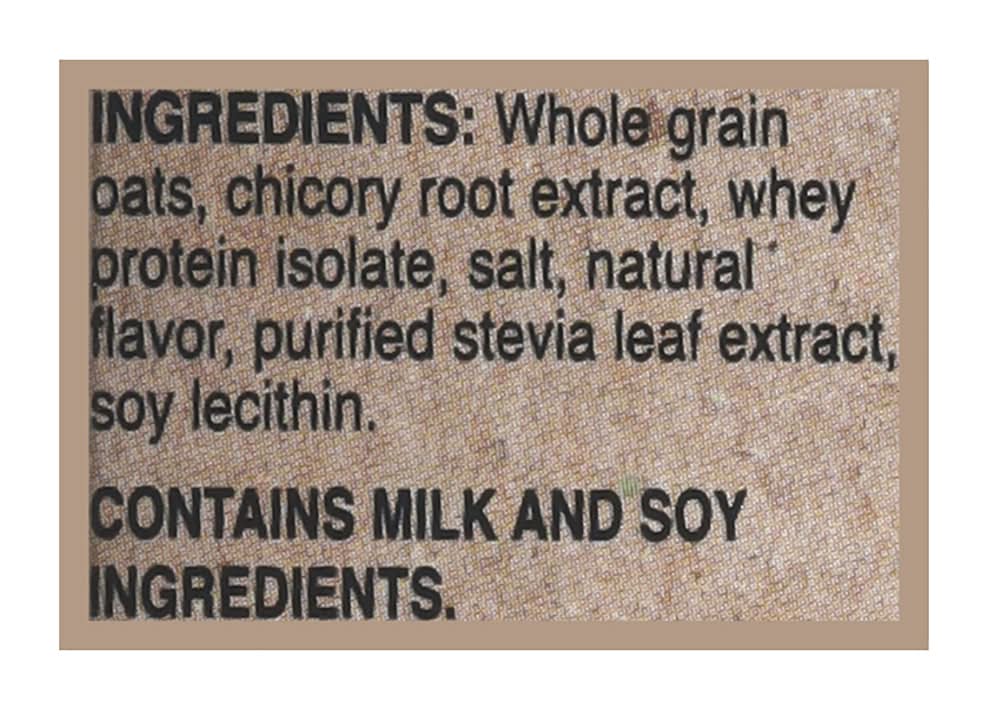Ingredients: Whole Grain Oats, Chicory Root Extract, Whey Protein Isolate, Salt, Natural Flavor, Purified Stevia Leaf Extract, Soy Lecithin Contains: Milk, Soybeans, Oat