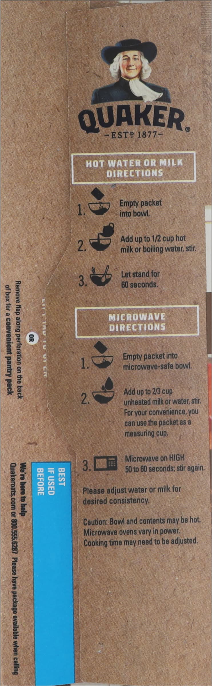 Hot water or milk directions: 1. empty packet into bowl. 2. add up to 1/2 cup hot milk or boiling water, stir. 3. let stand for 60 seconds. microwave directions: 1. empty packet into microwave-safe bowl. 2. add up to 2/3 cup unheated milk or water, stir. for your convenience, you can use the packet as a measuring cup. 3. microwave on high 50 to 60 seconds; stir again. please adjust water or milk for desired consistency. caution: bowl and contents may be hot. microwave ovens vary in power. cooking time may need to be adjusted. please adjust water or milk for desired consistency. two ways to open: (1) lift here to open. or (2) for a convenient pantry pack, on back of box, press in and pull up along perforation to remove flap.