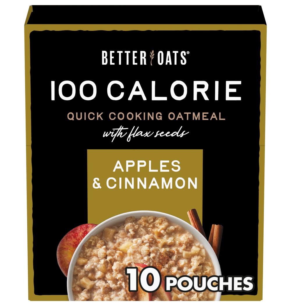 Feel good about what you feed your family in the mornings with Better Oats 100 Calorie Apples and Cinnamon Oatmeal with Flax Seeds. These 10 cinnamon apple instant oatmeal pouches contain a delicious combination of whole grain rolled oats, flax seeds, and natural apple cinnamon flavor that delivers a wholesome hot oatmeal taste with every spoonful. Each packet cooks in 90 seconds and has 100 calories so you can feel good about what you eat.