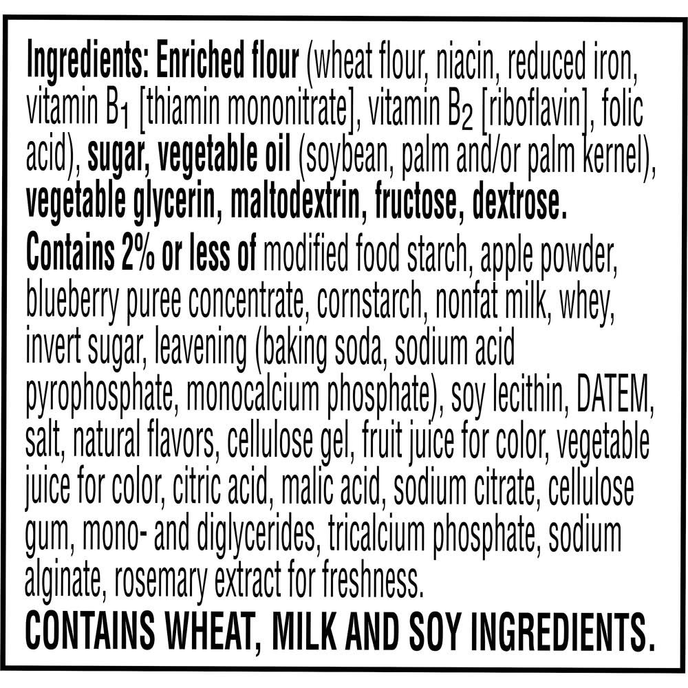 Ingredients: Enriched Flour (Wheat Flour, Niacin, Reduced Iron, Vitamin B1 [Thiamin Mononitrate], Vitamin B2 [Riboflavin], Folic Acid), Sugar, Vegetable Oil (Soybean, Palm And/Or Palm Kernel), Vegetable Glycerin, Maltodextrin, Fructose, Dextrose. Contains 2% Or Less Of Modified Food Starch, Apple Powder, Blueberry Puree Concentrate, Cornstarch, Nonfat Milk, Whey, Invert Sugar, Leavening (Baking Soda, Sodium Acid Pyrophosphate, Monocalcium Phosphate), Soy Lecithin, Datem, Salt, Natural Flavors, Cellulose Gel, Fruit Juice For Color, Vegetable Juice For Color, Citric Acid, Malic Acid, Sodium Citrate, Cellulose Gum, Mono- And Diglycerides, Tricalcium Phosphate, Sodium Alginate, Rosemary Extract For Freshness. Contains: Contains wheat, milk and soy ingredients.