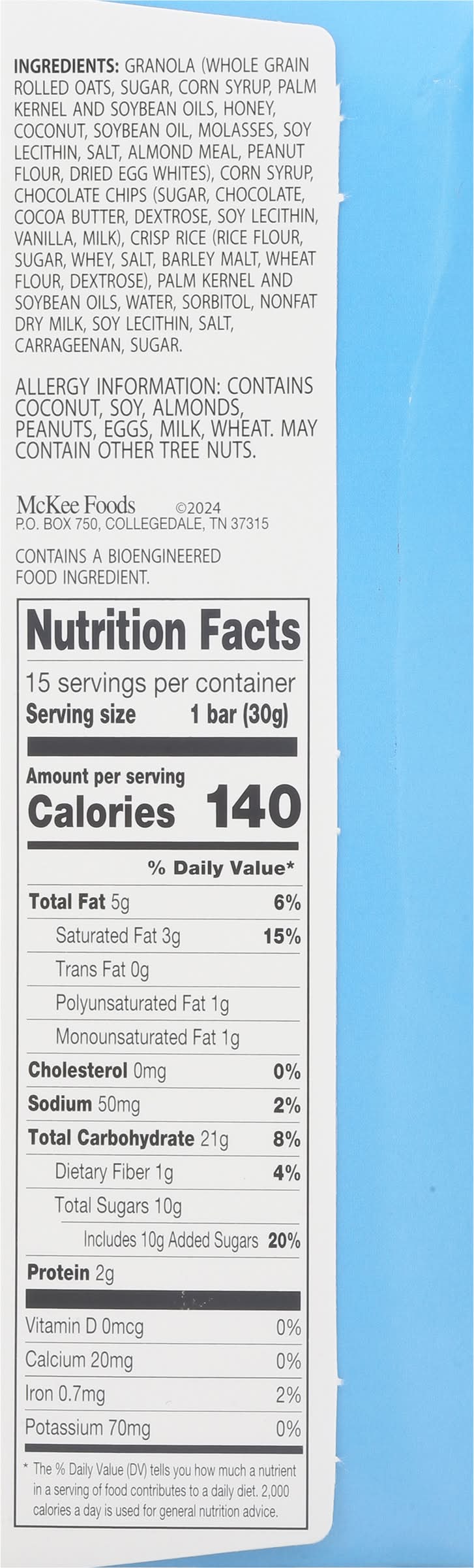 Granola Bars, Chocolate Chip, Chewy, Value Pack • Flavor: Chocolate chip • McKee Foods, PO Box 750, Collegedale, TN, 37315 • Packaging: Reusable