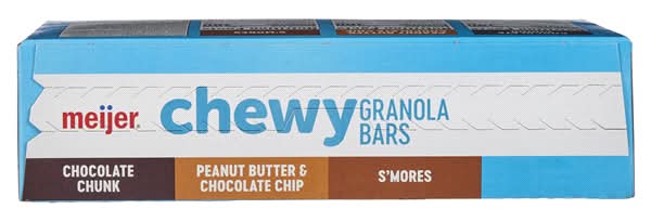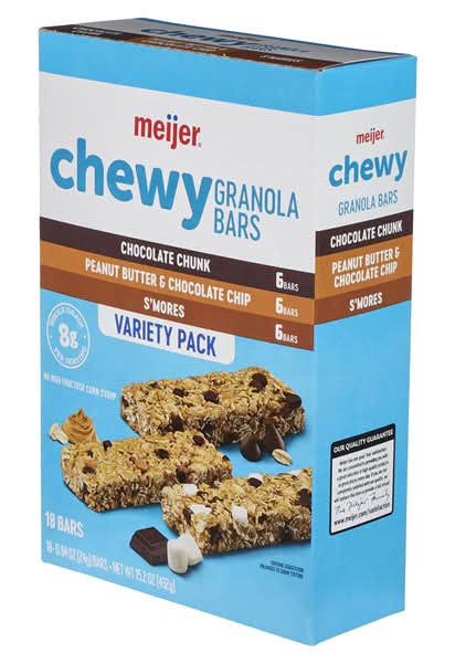 Savor the delightful flavors of Chocolate Chunk, Peanut Butter & Chocolate Chip, and S'mores with Meijer Chewy Granola Bars Variety Pack. Made with 8 grams of whole grains per serving and free from high fructose corn syrup, these bars offer a quality, convenient snack. Flavor: Assorted