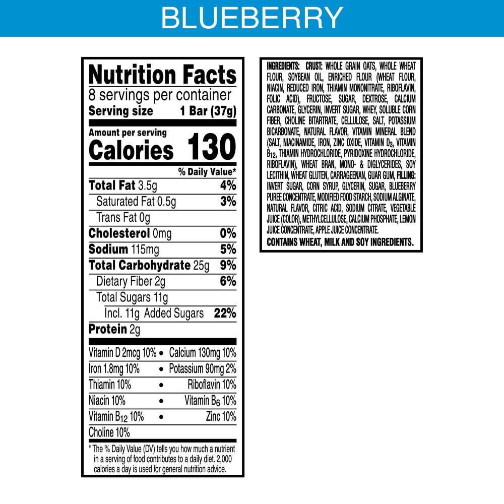 Ingredients: Crust: Whole Grain Oats, Whole Wheat Flour, Soybean Oil, Enriched Flour (Wheat Flour, Niacin, Reduced Iron, Thiamin Mononitrate, Riboflavin, Folic Acid), Fructose, Sugar, Dextrose, Calcium Carbonate, Glycerin, Invert Sugar, Whey, Soluble Corn Fiber, Choline Bitartrate, Cellulose, Salt, Potassium Bicarbonate, Natural Flavor, Vitamin Mineral Blend (Salt, Niacinamide, Iron, Zinc Oxide, Vitamin D3, Vitamin B12, Thiamin Hydrochloride, Pyridoxine Hydrochloride, Riboflavin), Wheat Bran, Mono- Diglycerides, Soy Lecithin, Wheat Gluten, Carrageenan, Guar Gum, Filling: Invert Sugar, Corn Syrup, Glycerin, Sugar, Blueberry Puree Concentrate, Modified Food Starch, Sodium Alginate, Natural Flavor, Citric Acid, Sodium Citrate, Vegetable Juice (Color), Methylcellulose, Calcium Phosphate, Lemon Juice Concentrate, Apple Juice Concentrate. Contains: Contains wheat, milk and soy ingredients.