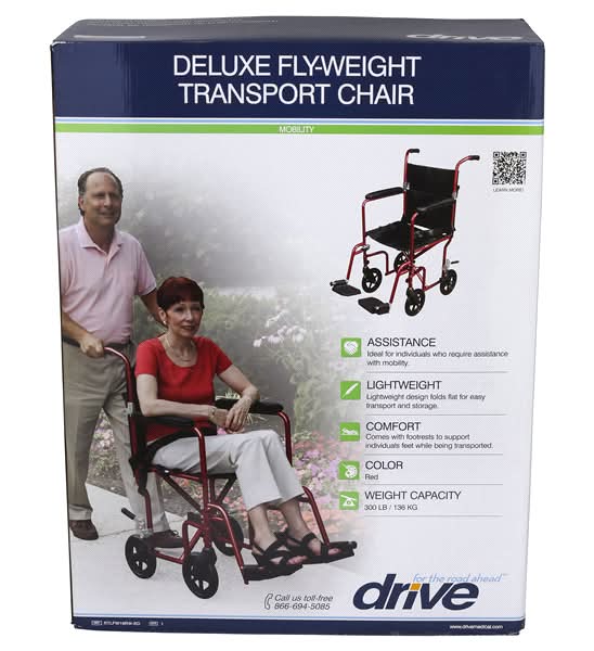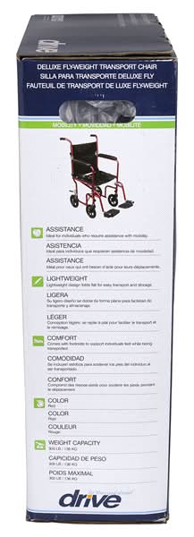 Crafted from aluminum, the Drive Medical Flyweight Lightweight Transport Wheelchair is distinguished by its eye-catching red hue. It is thoughtfully designed with removable casters and a foldable back, facilitated by an aluminum back release, which enhances its storability and portability. Safety is prioritized with the inclusion of a seat belt and rear wheel locks. For added convenience, this wheelchair comes with a carry pocket on the backrest, ideal for storing personal items. The seating is made comfortable with soft, plush upholstery, and the flared arms enable the chair to fold flat for ease of transport. The wheels are tailored to ensure smooth maneuverability across various surfaces. Color: Red